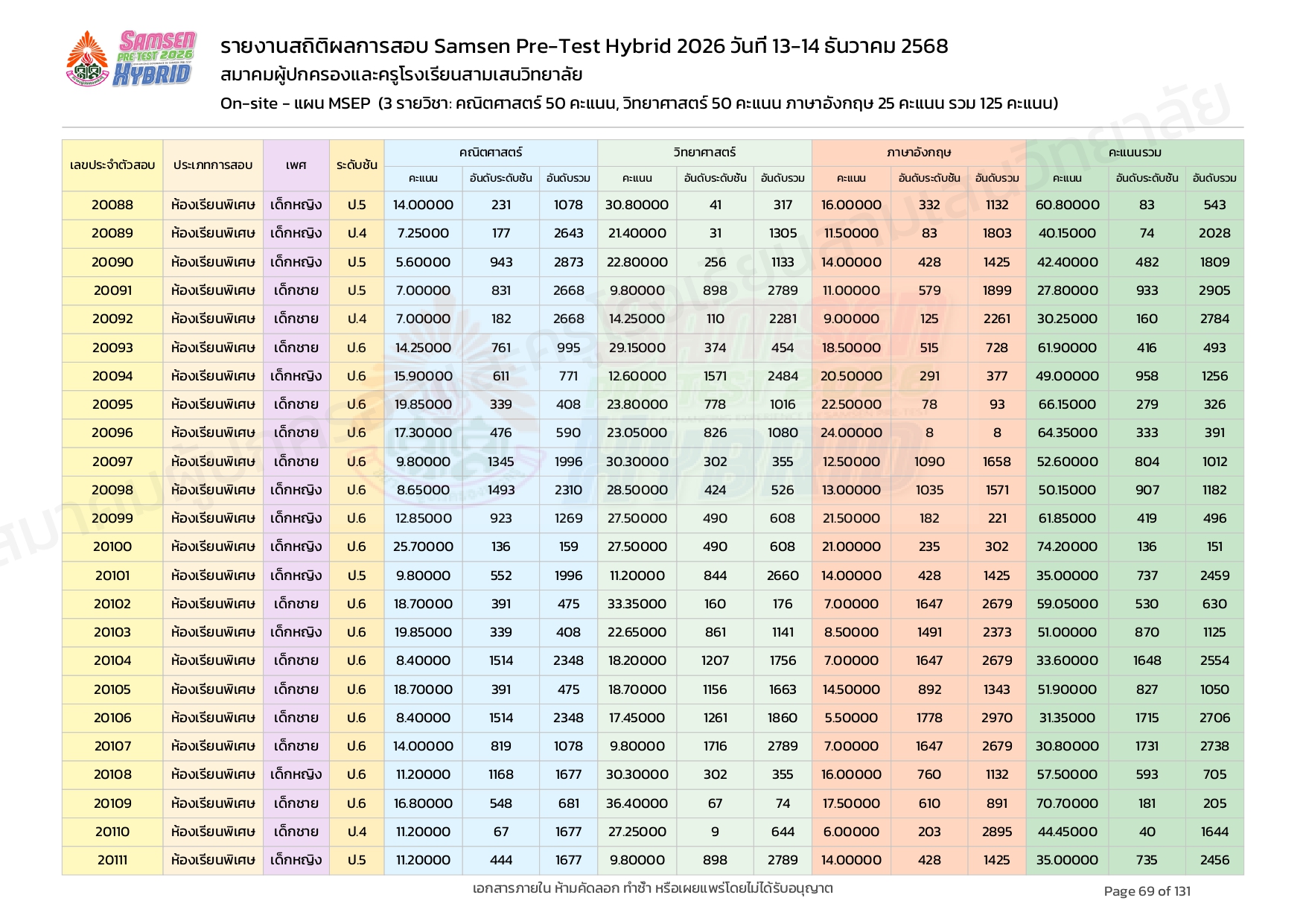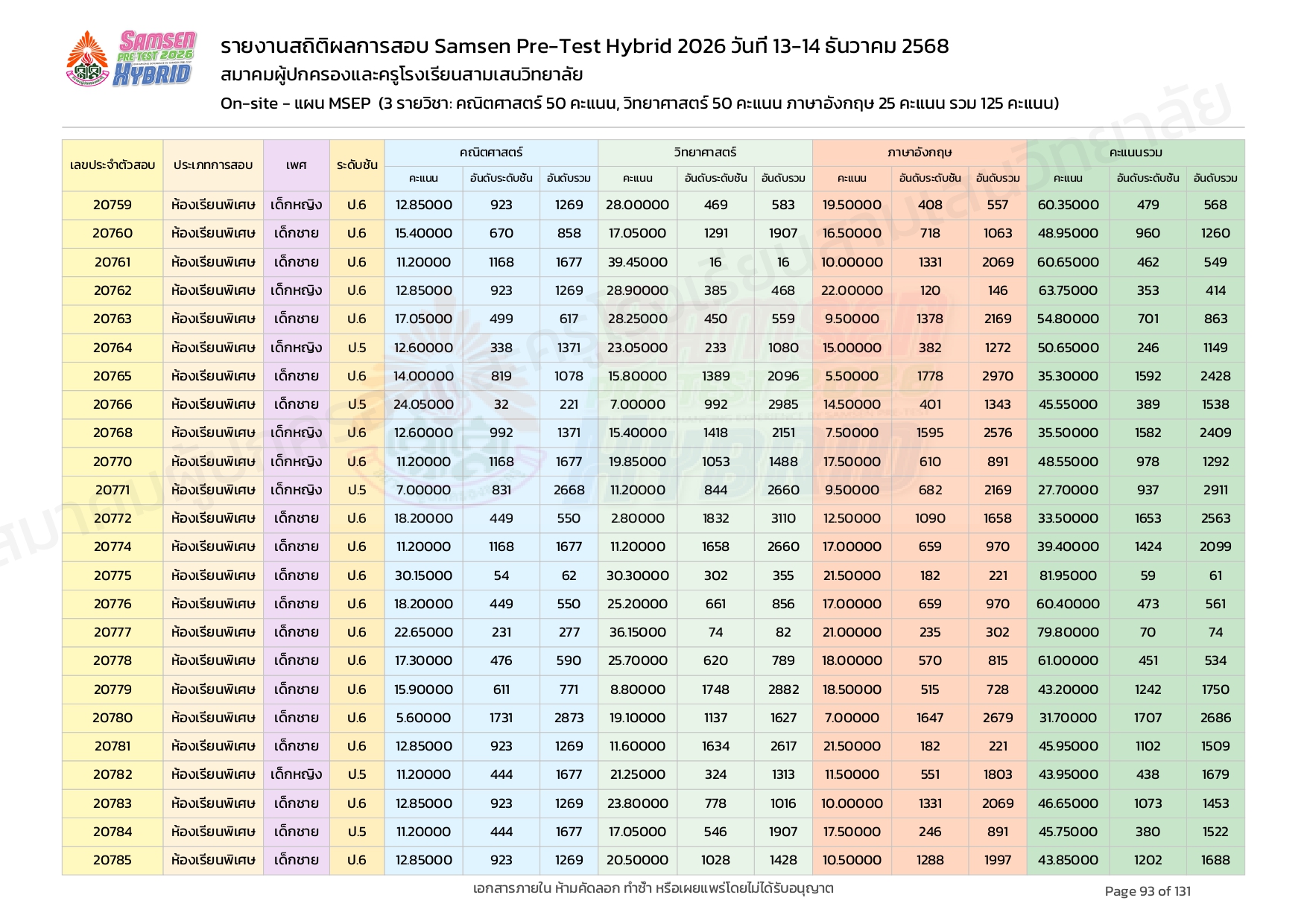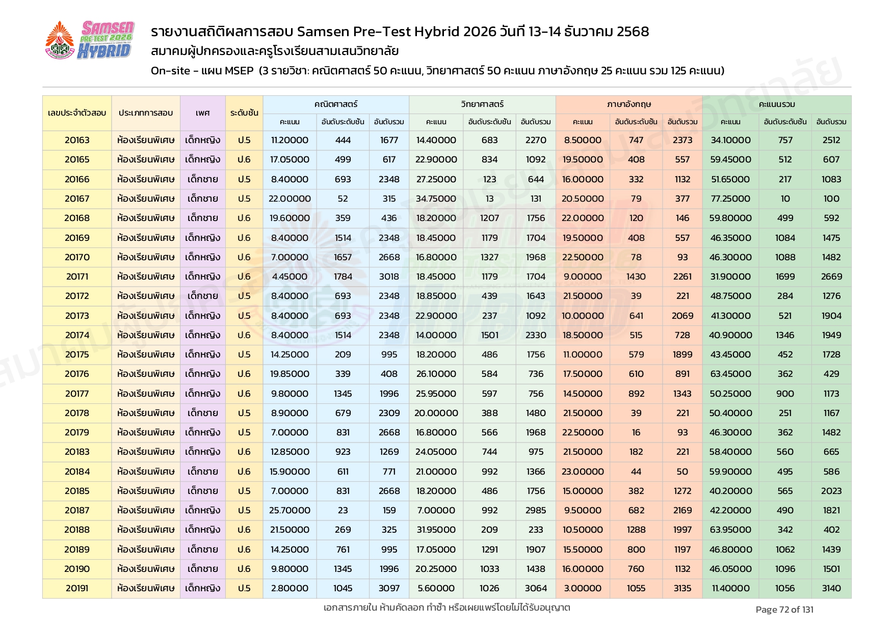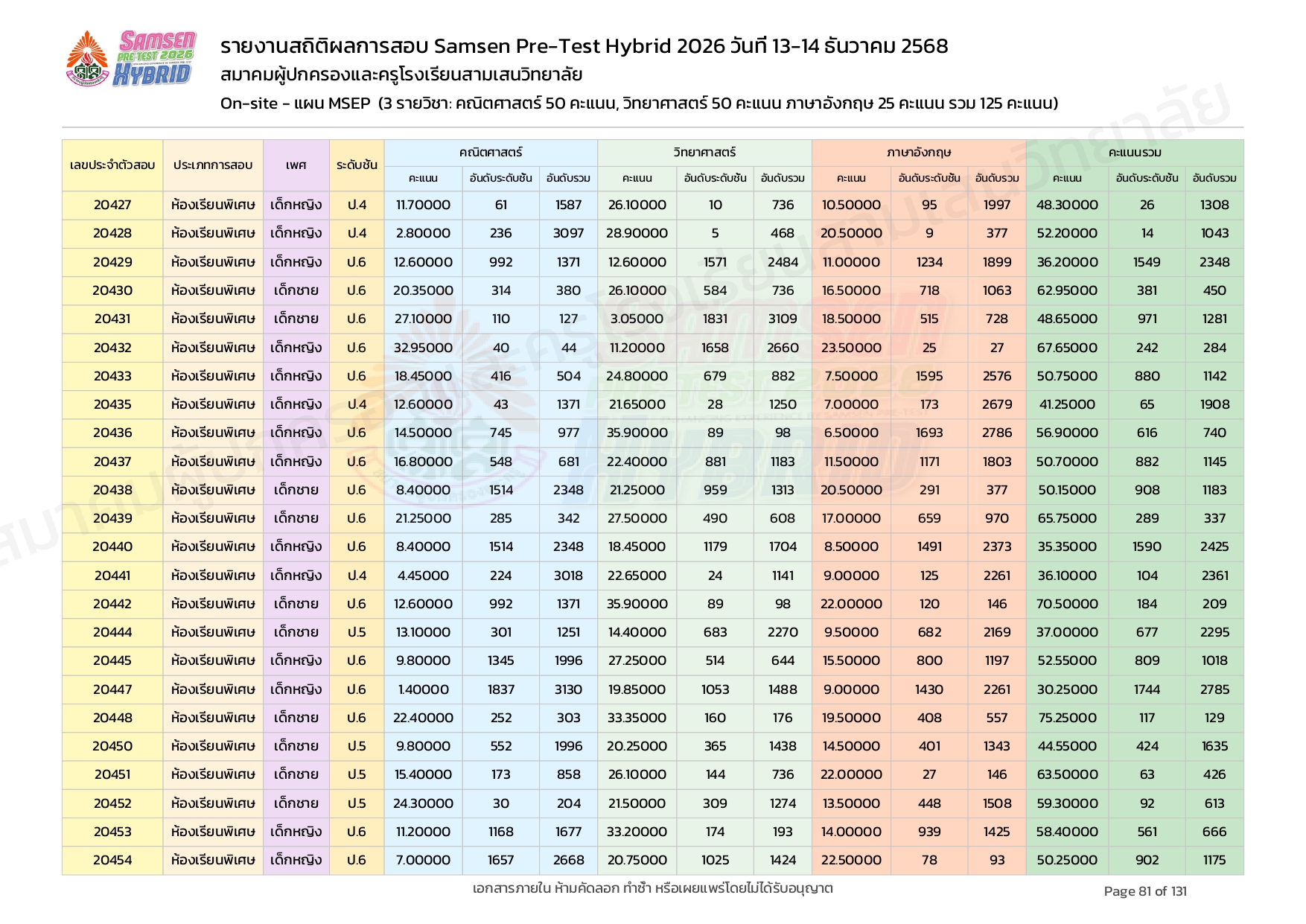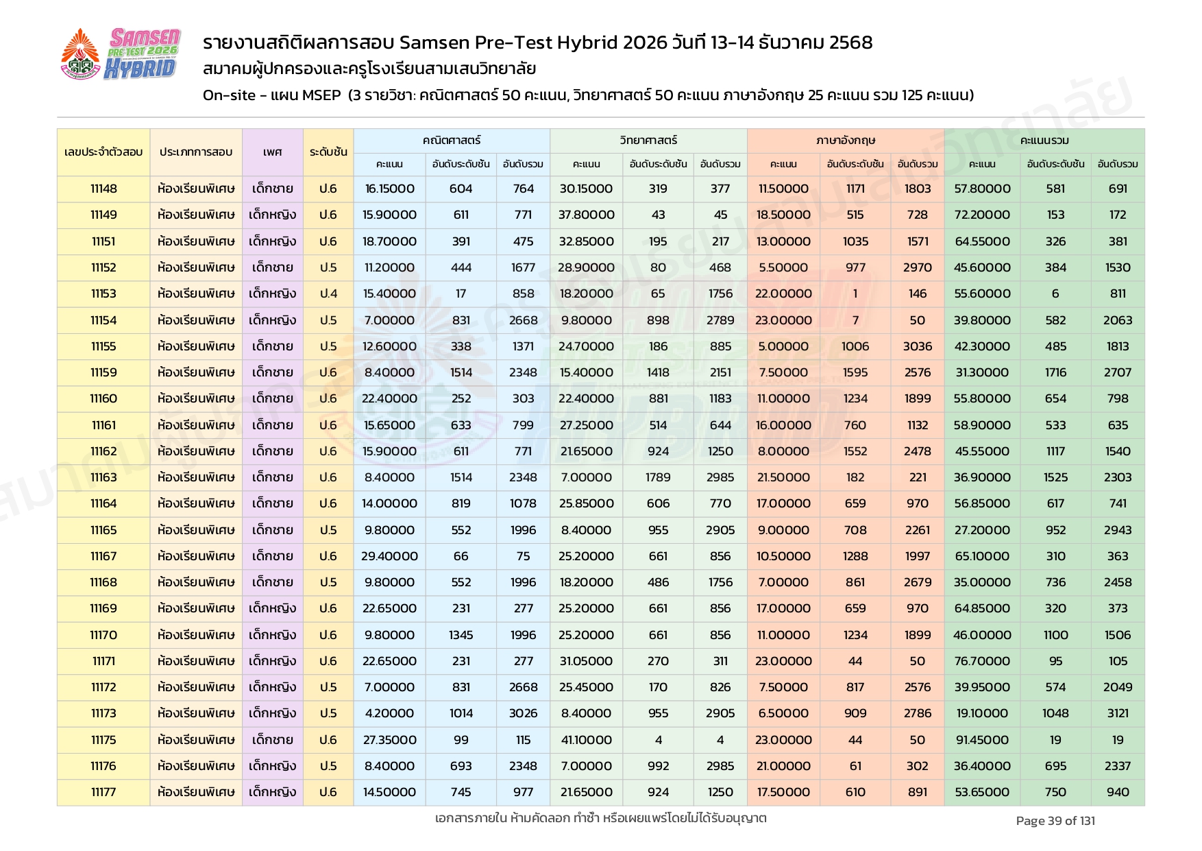 ผลคะแนนสอบ On-site จัดลำดับตามห้องเรียนพิเศษ MSEP