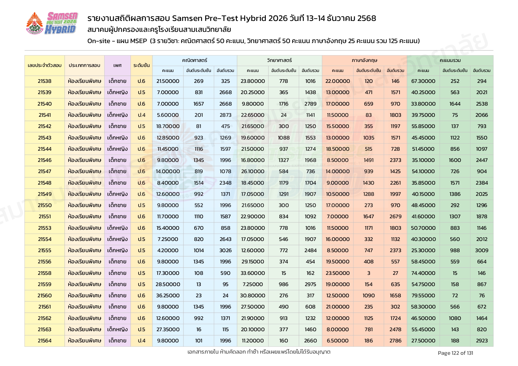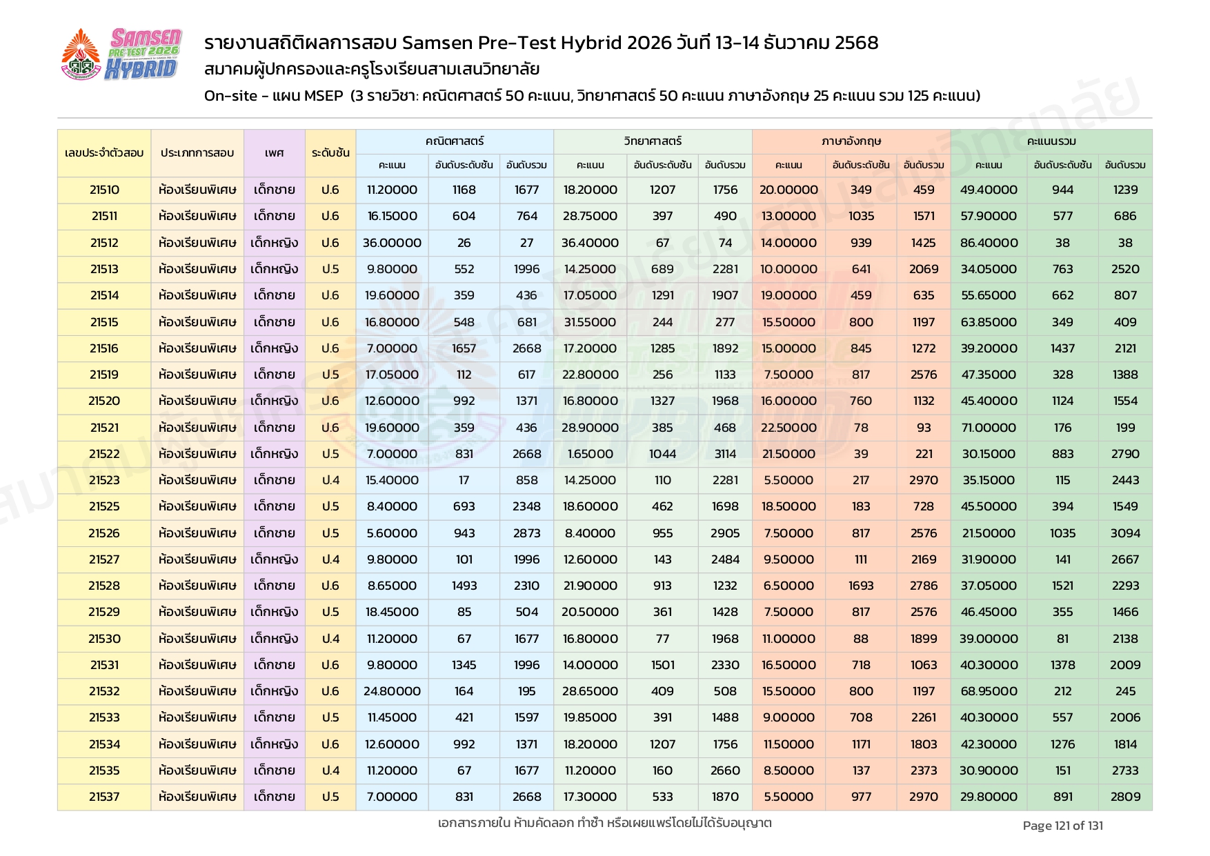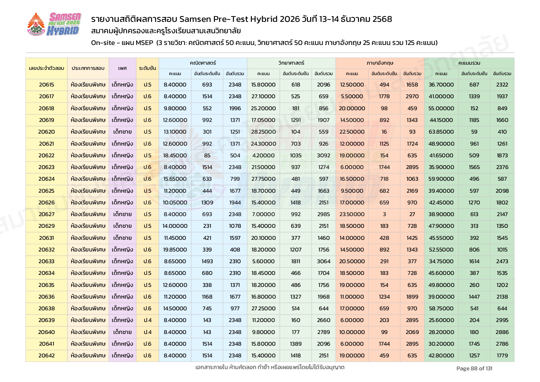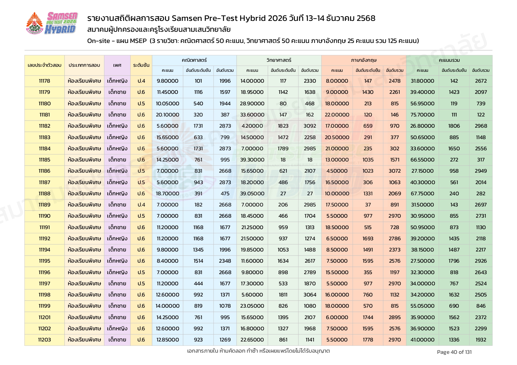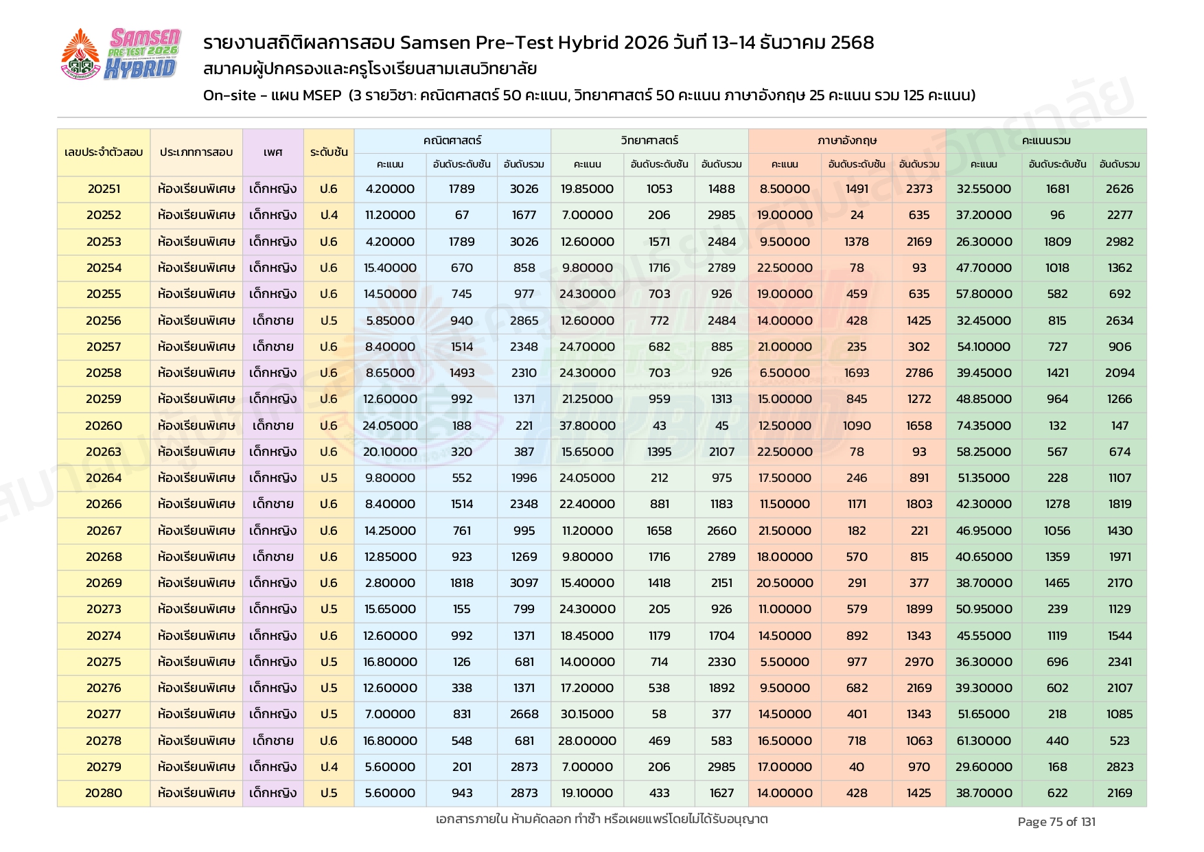ผลคะแนนสอบ On-site จัดลำดับตามห้องเรียนพิเศษ MSEP
