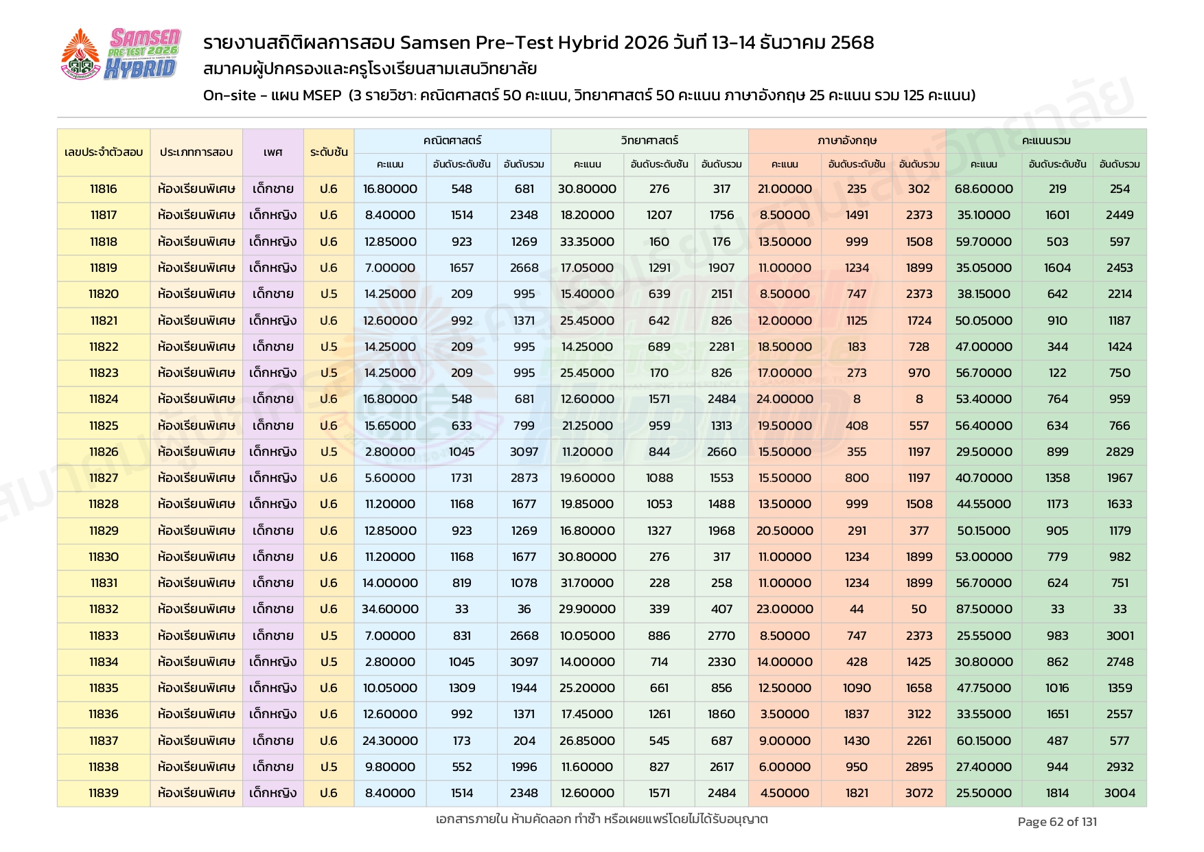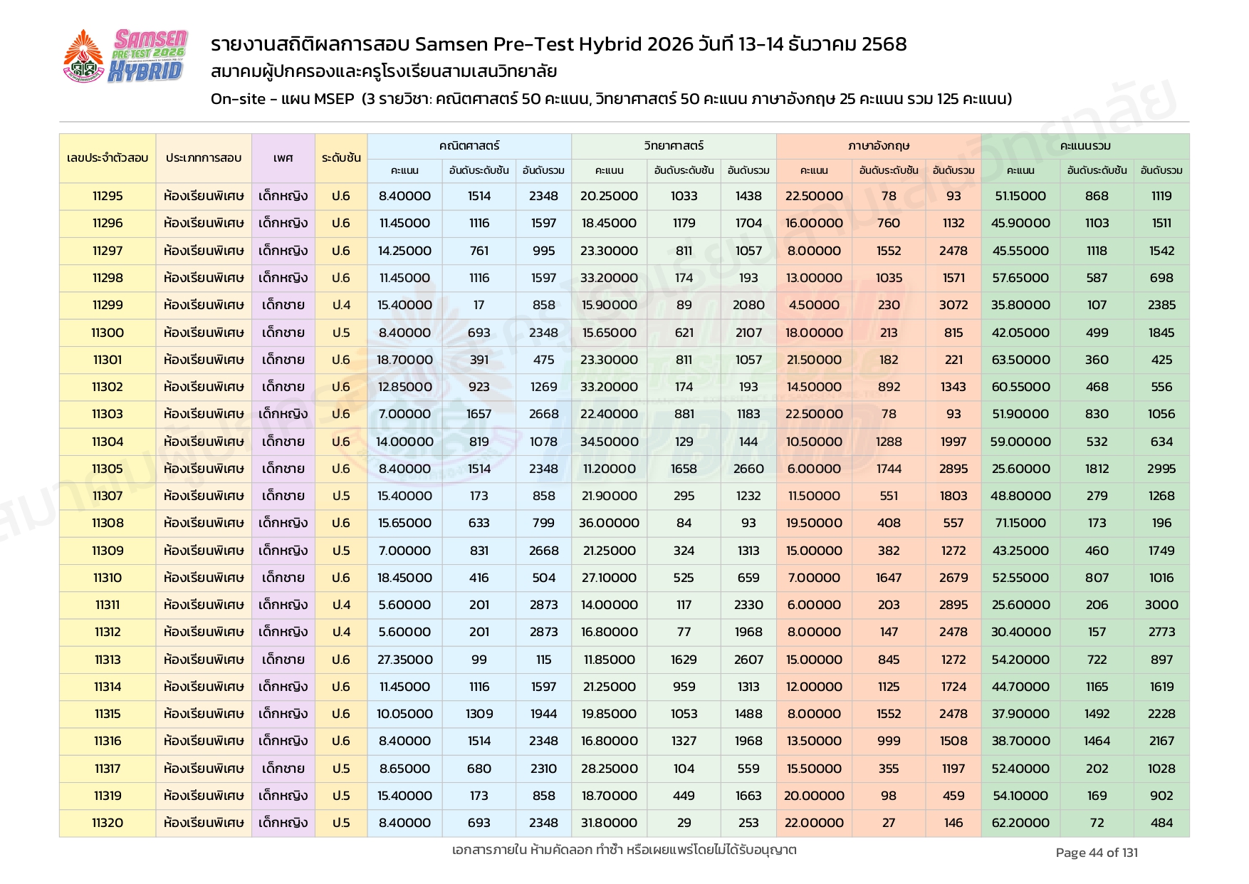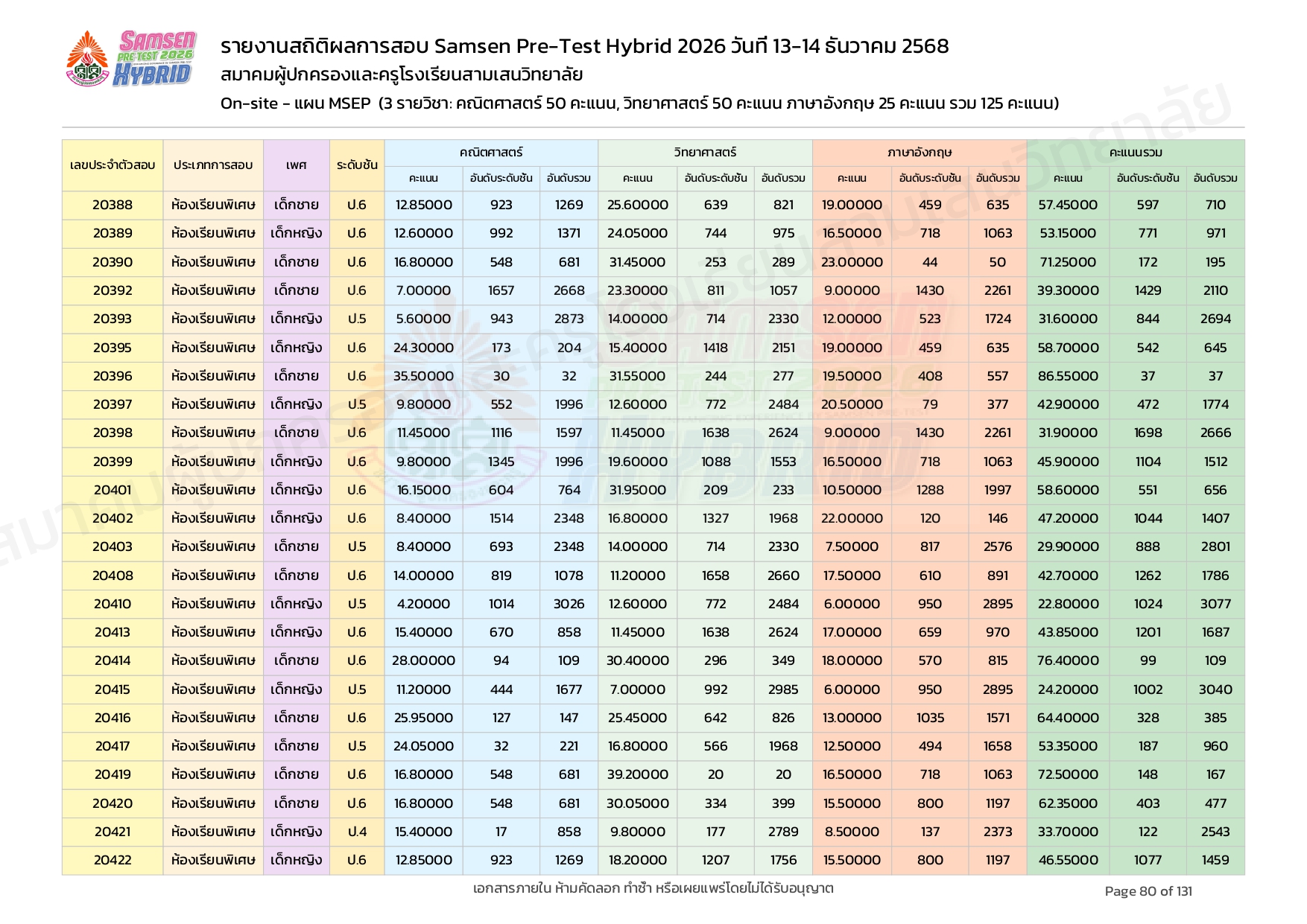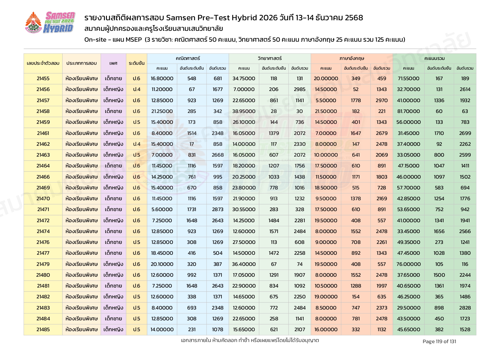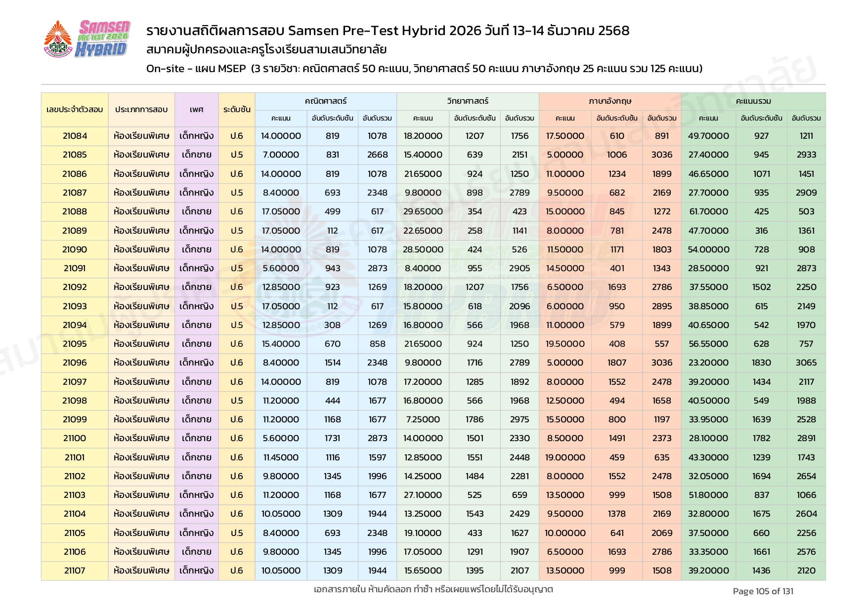 ผลคะแนนสอบ On-site จัดลำดับตามห้องเรียนพิเศษ MSEP