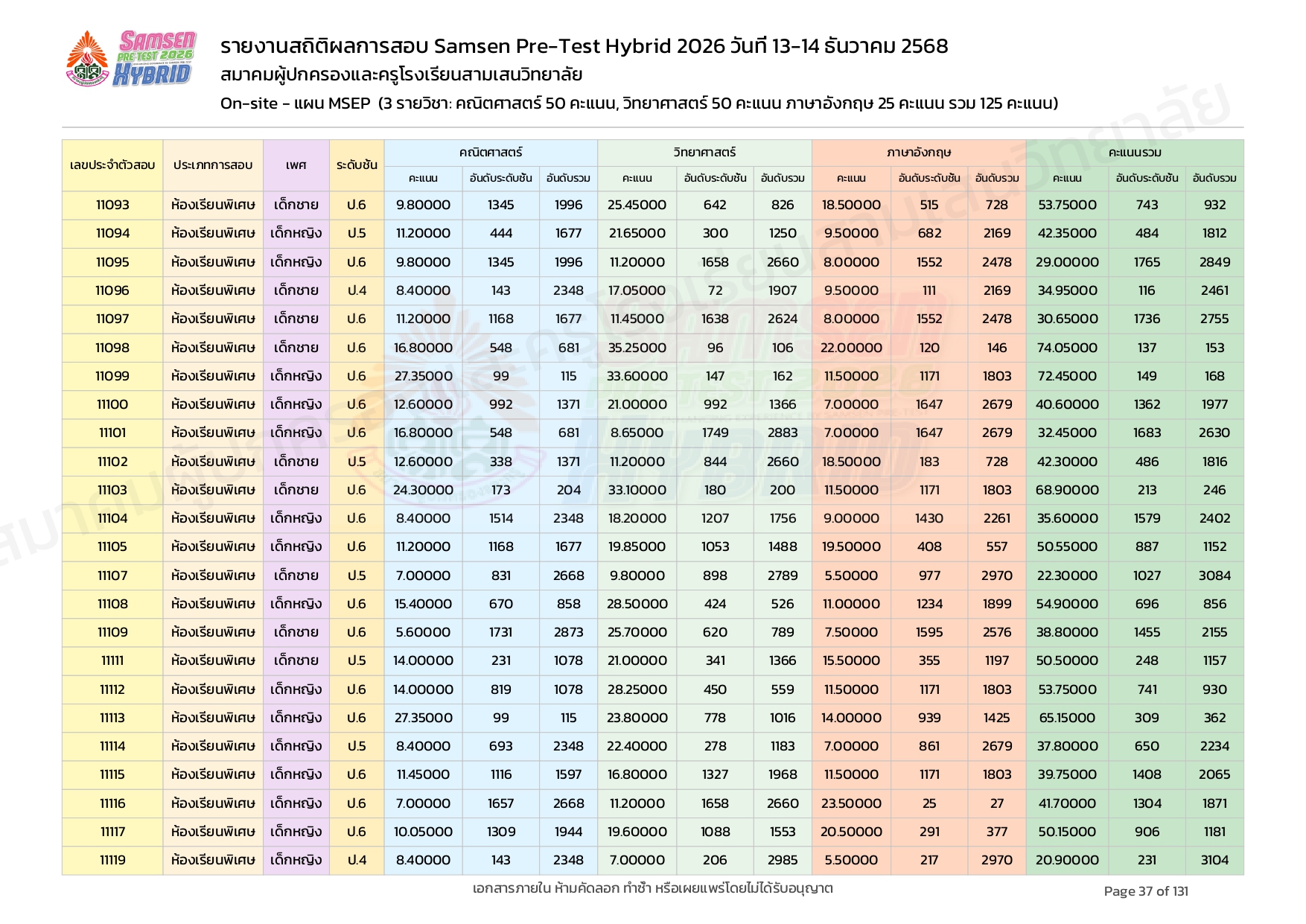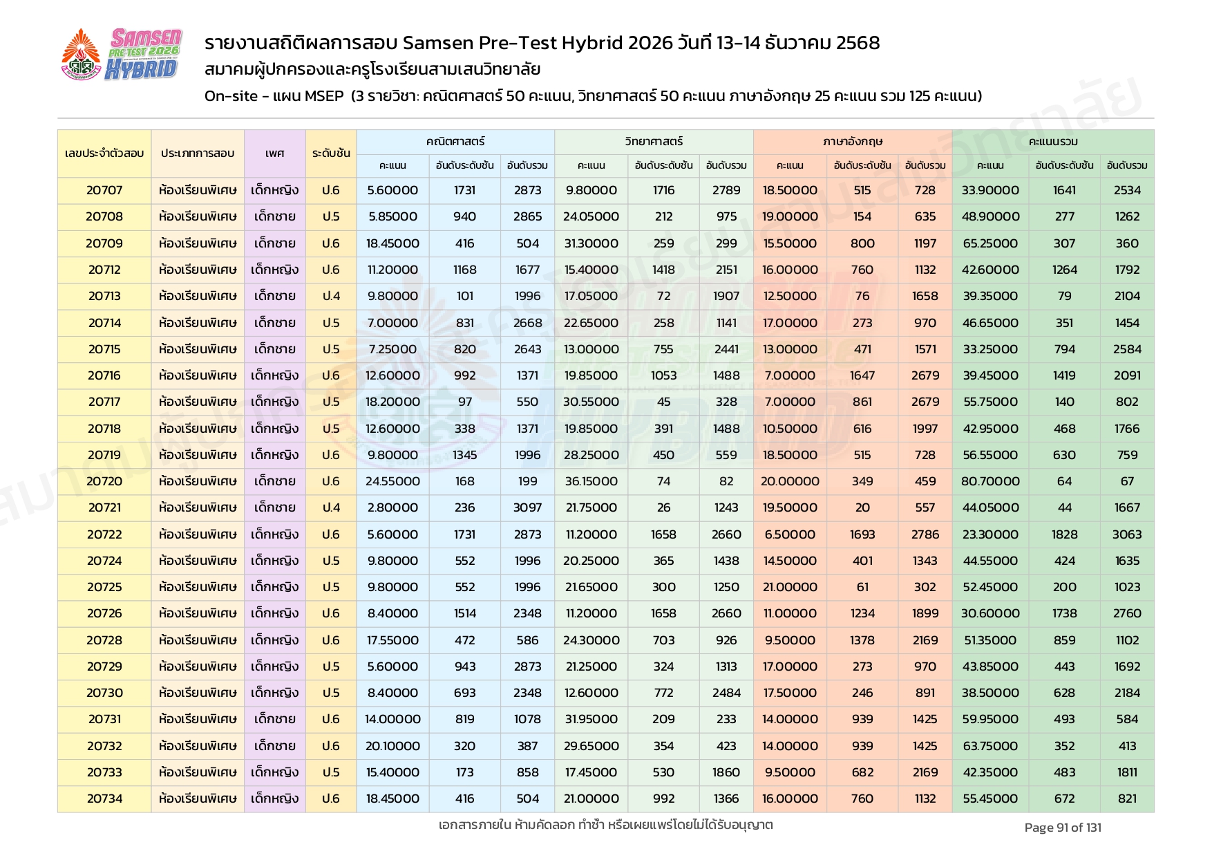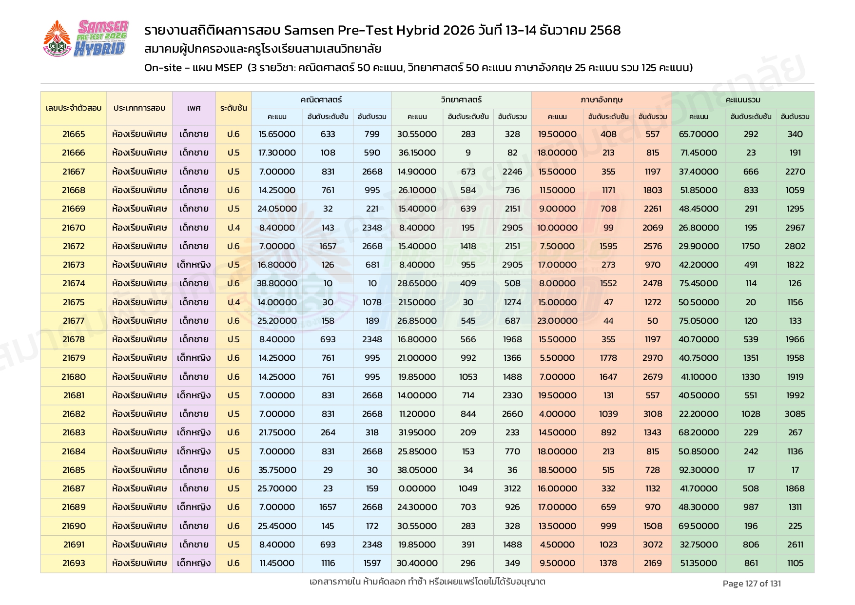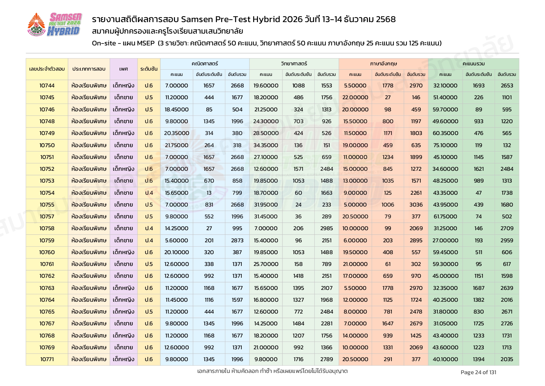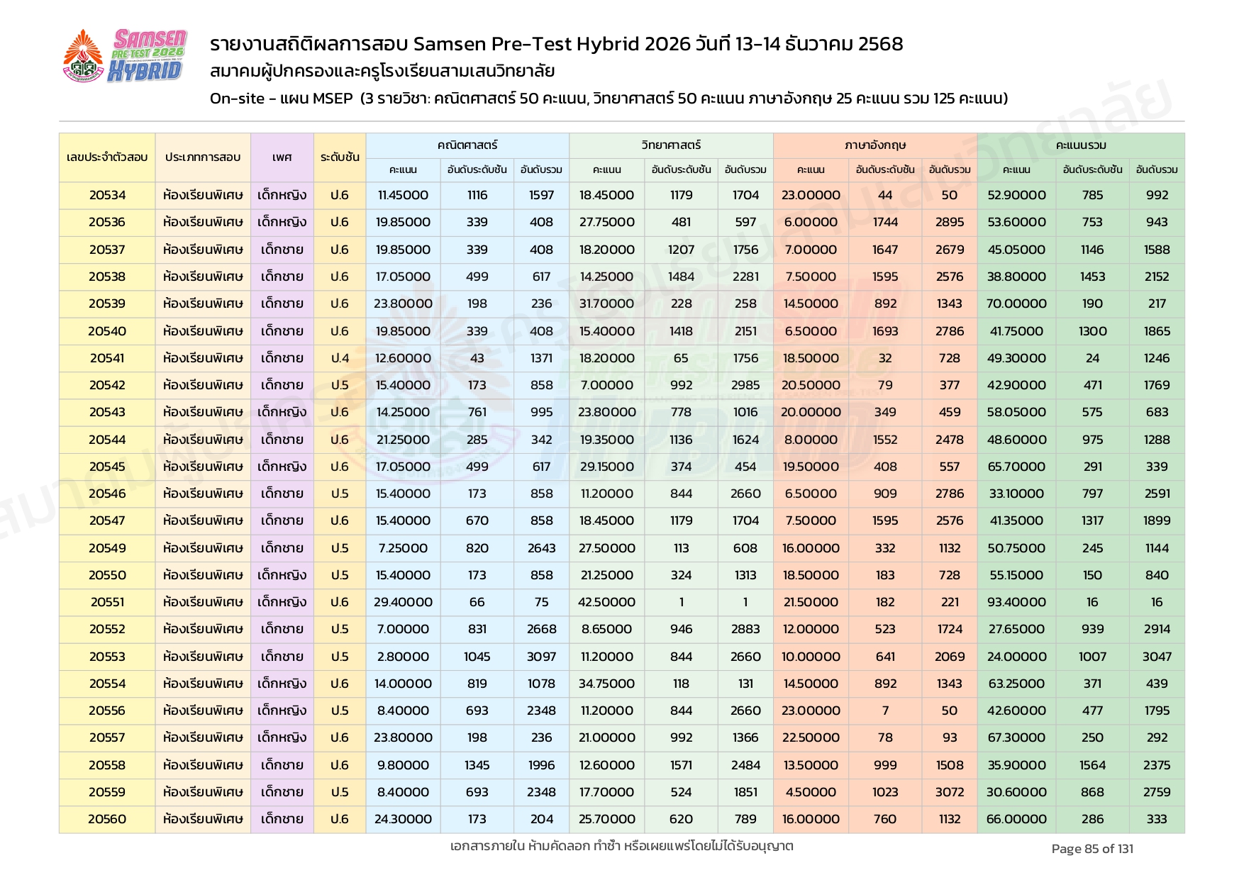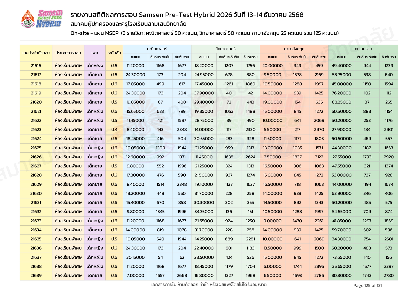 ผลคะแนนสอบ On-site จัดลำดับตามห้องเรียนพิเศษ MSEP