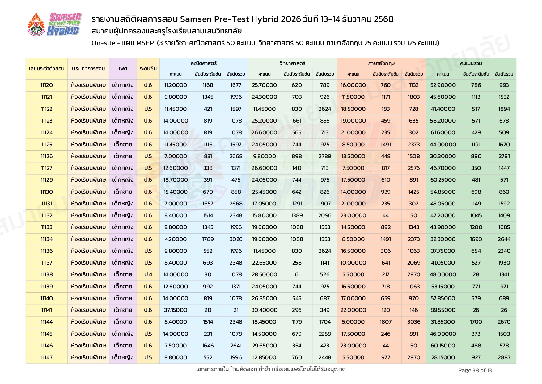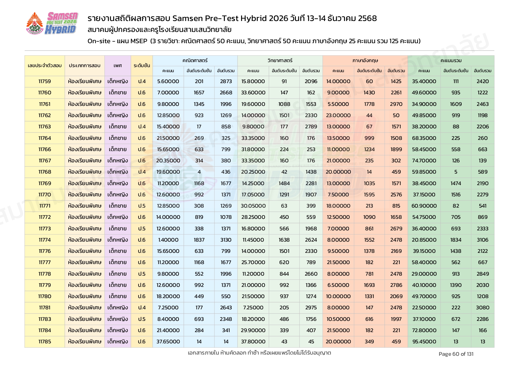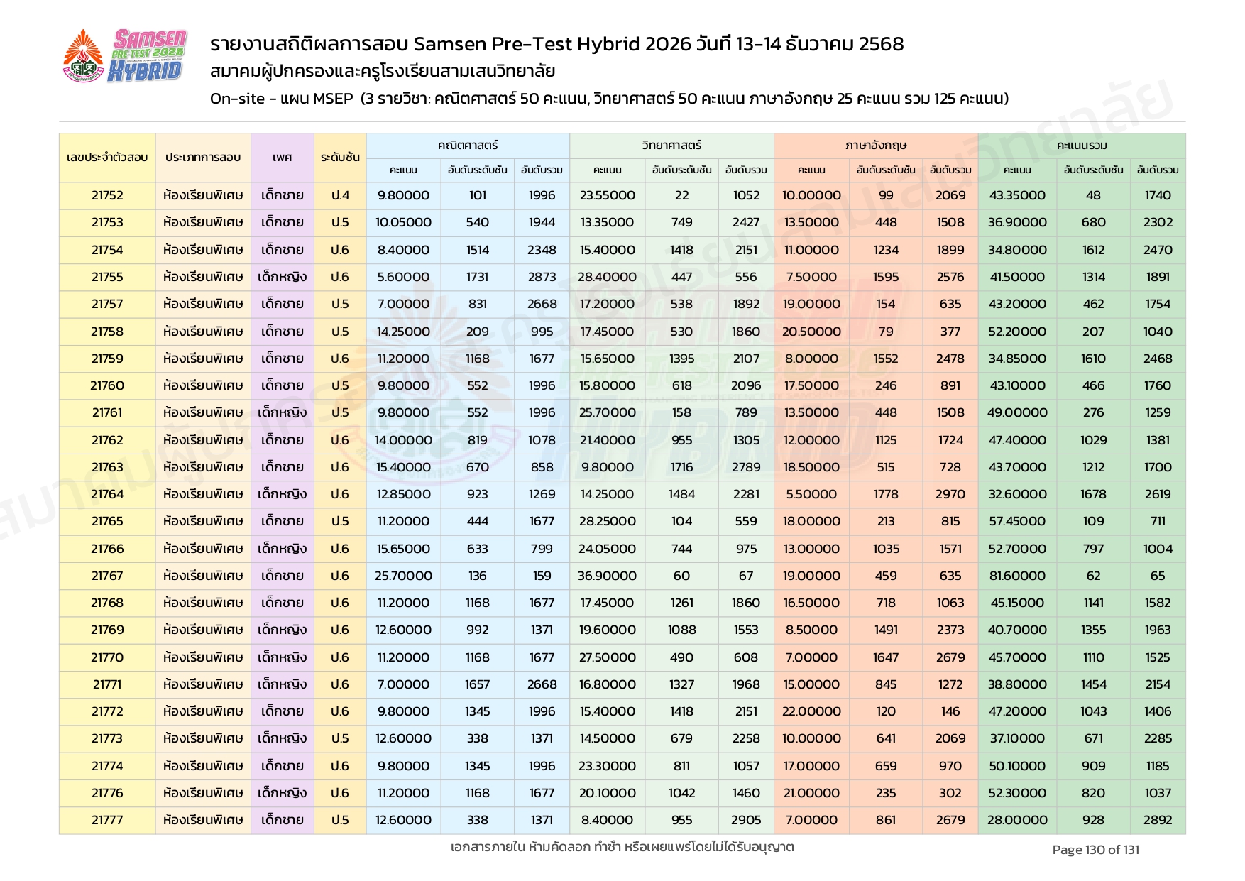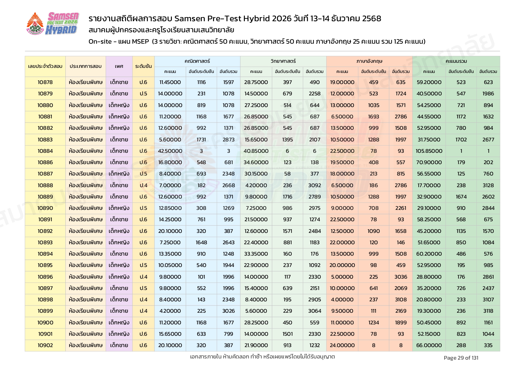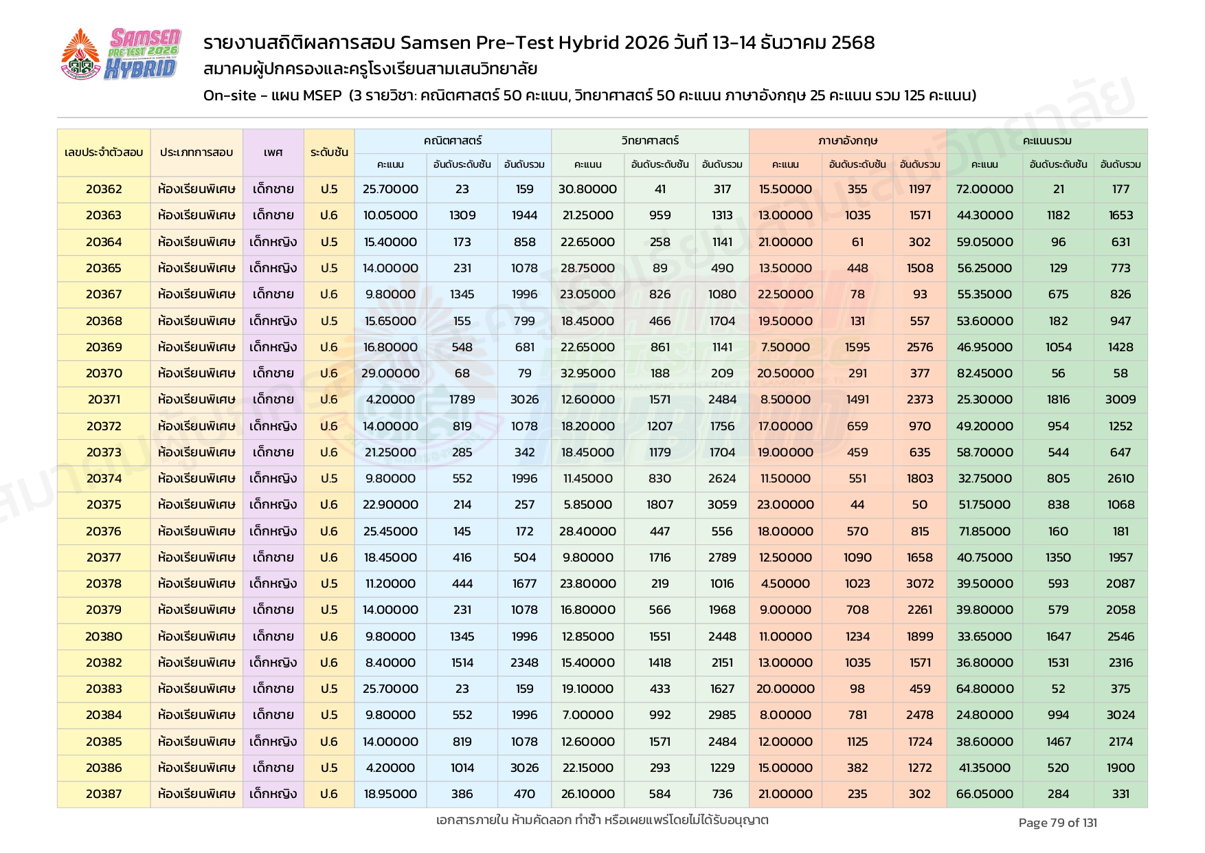 ผลคะแนนสอบ On-site จัดลำดับตามห้องเรียนพิเศษ MSEP