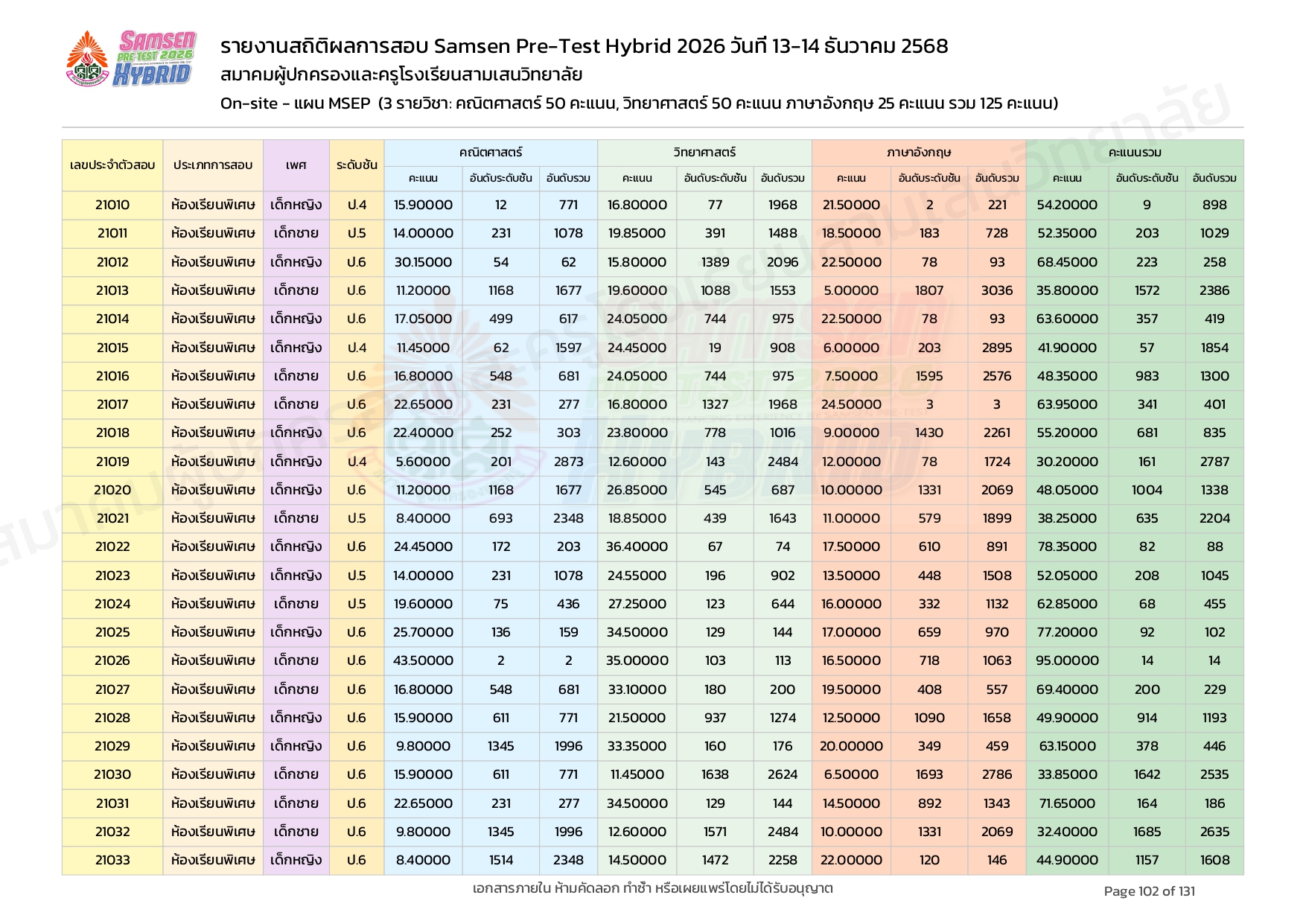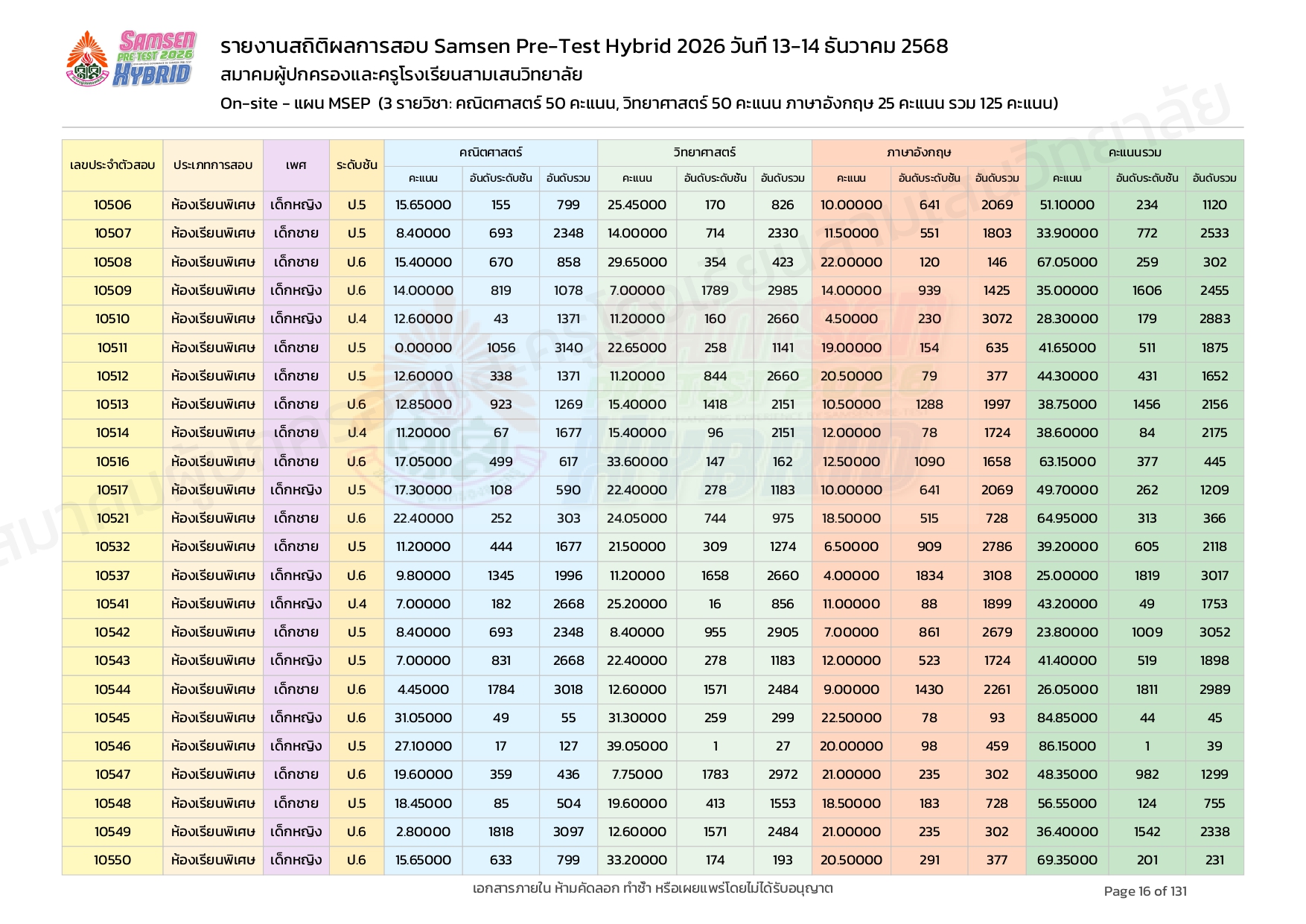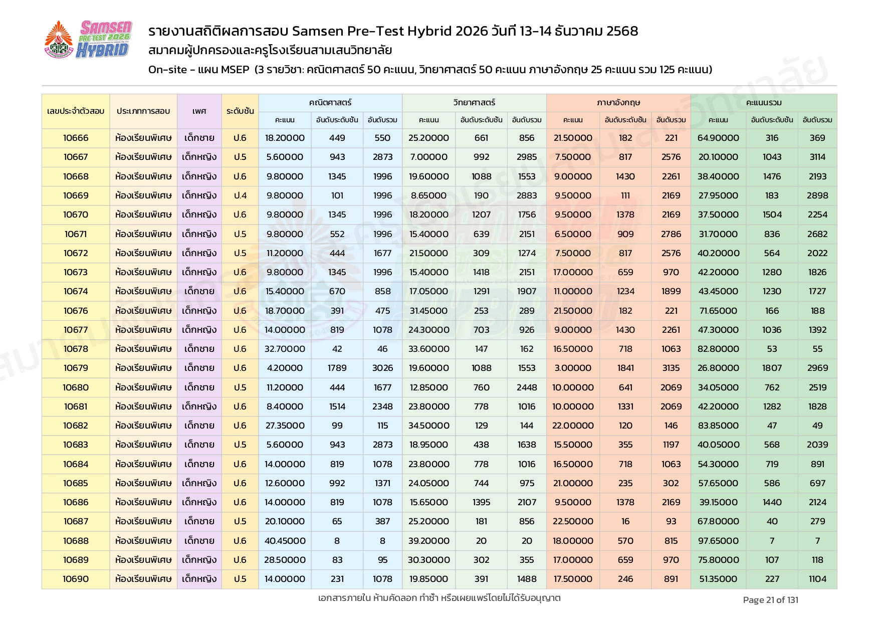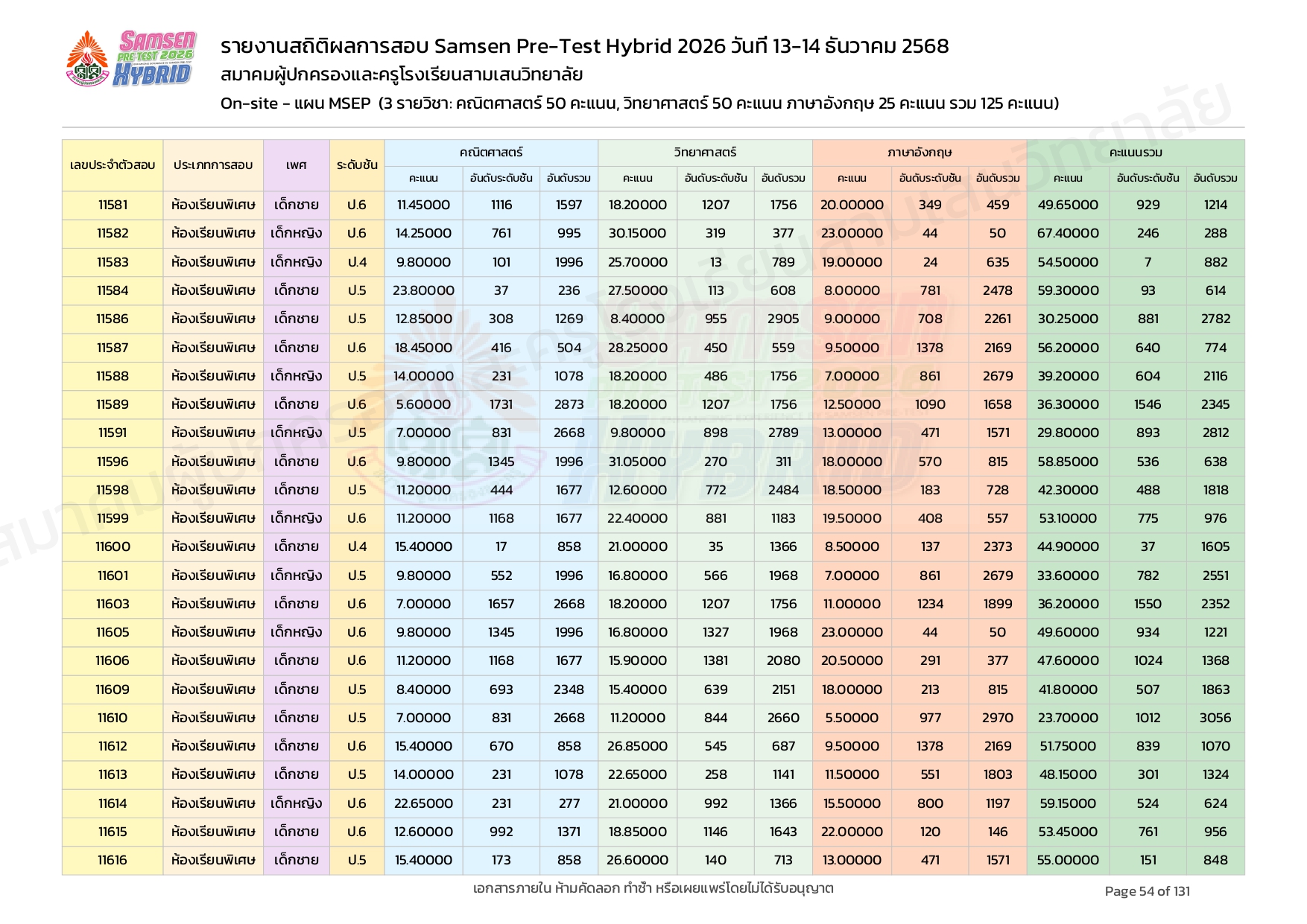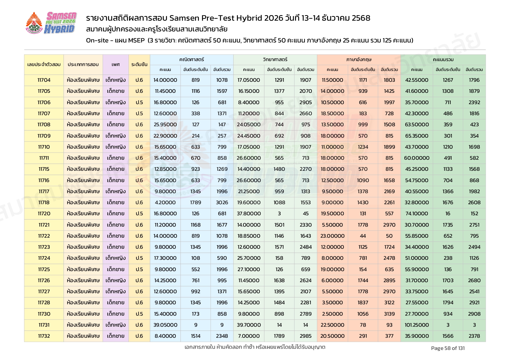 ผลคะแนนสอบ On-site จัดลำดับตามห้องเรียนพิเศษ MSEP