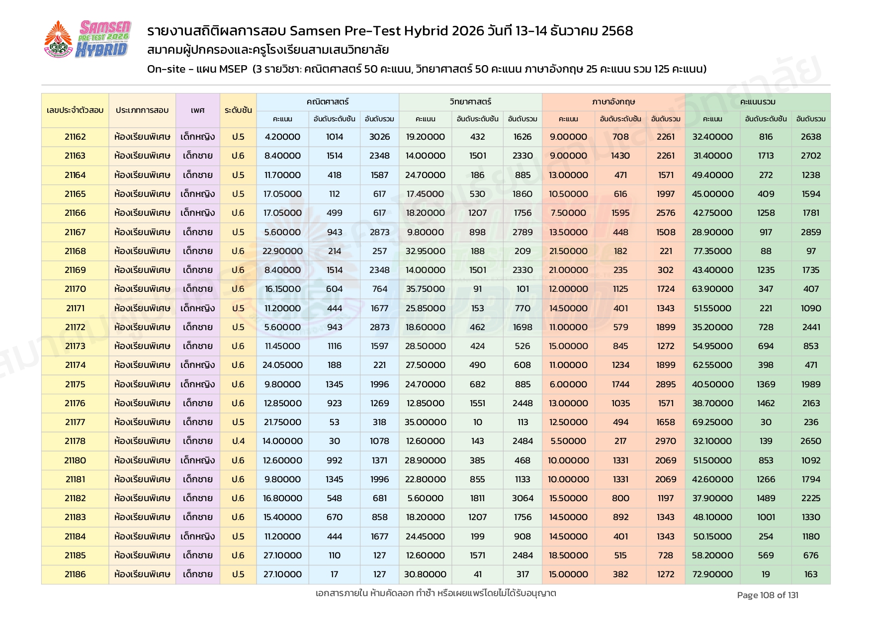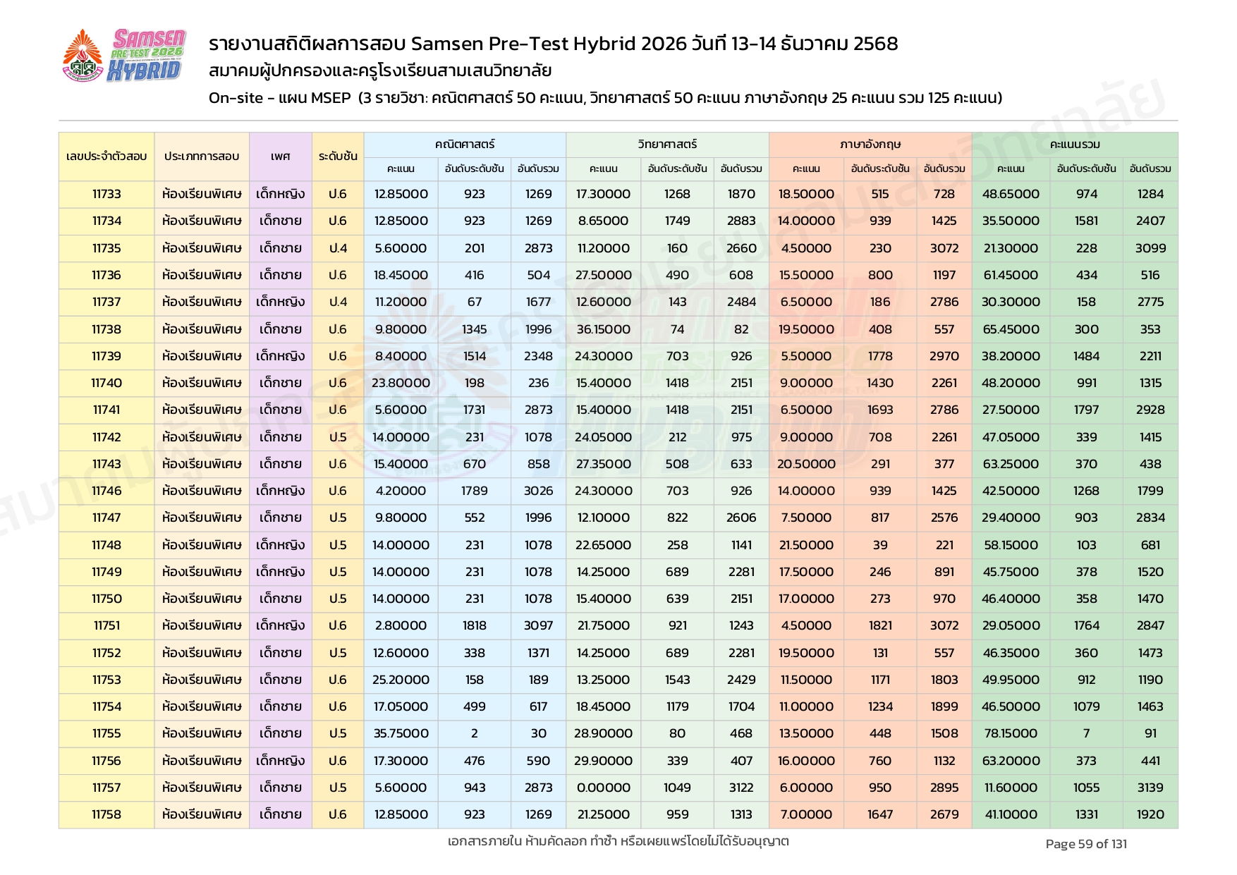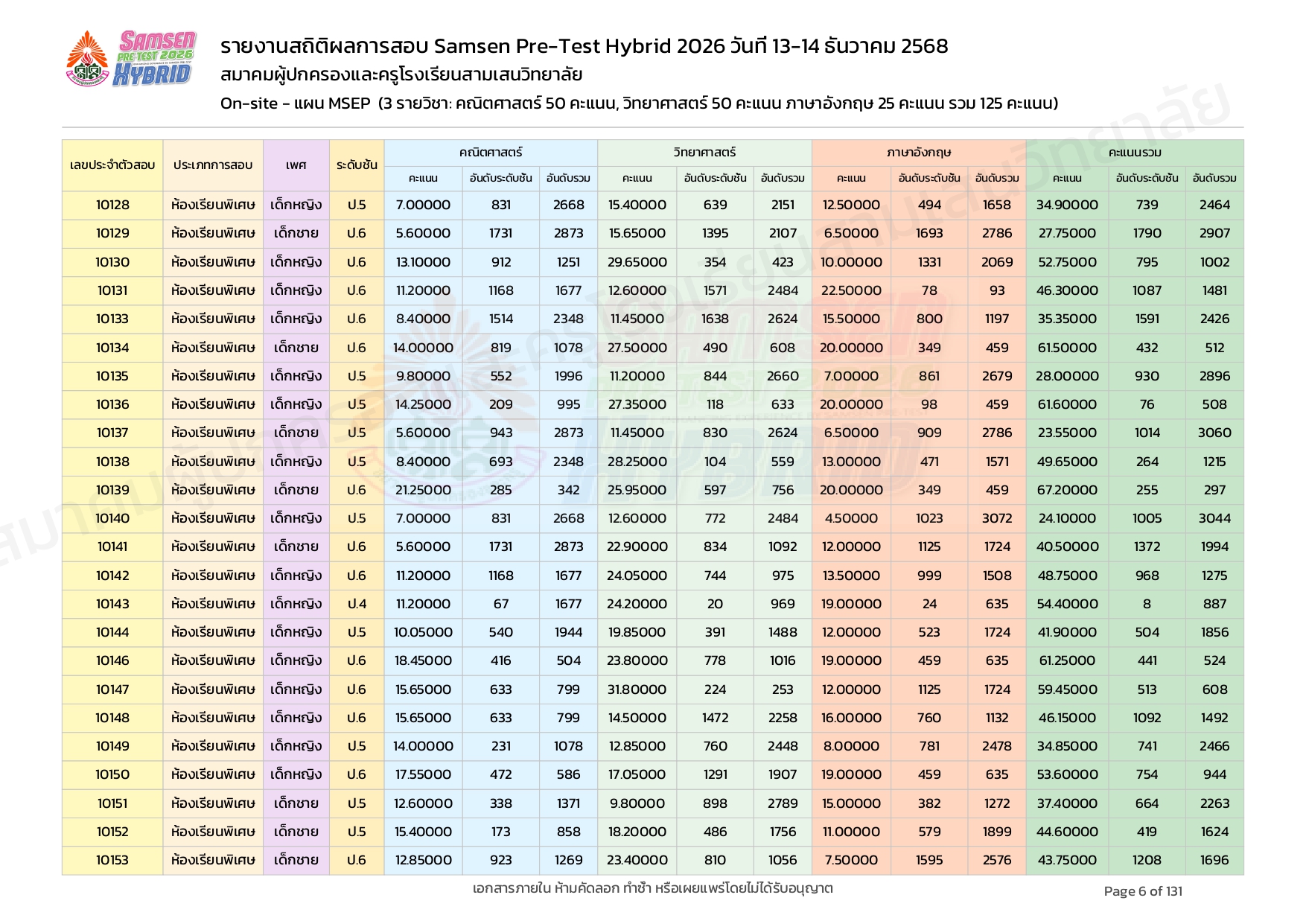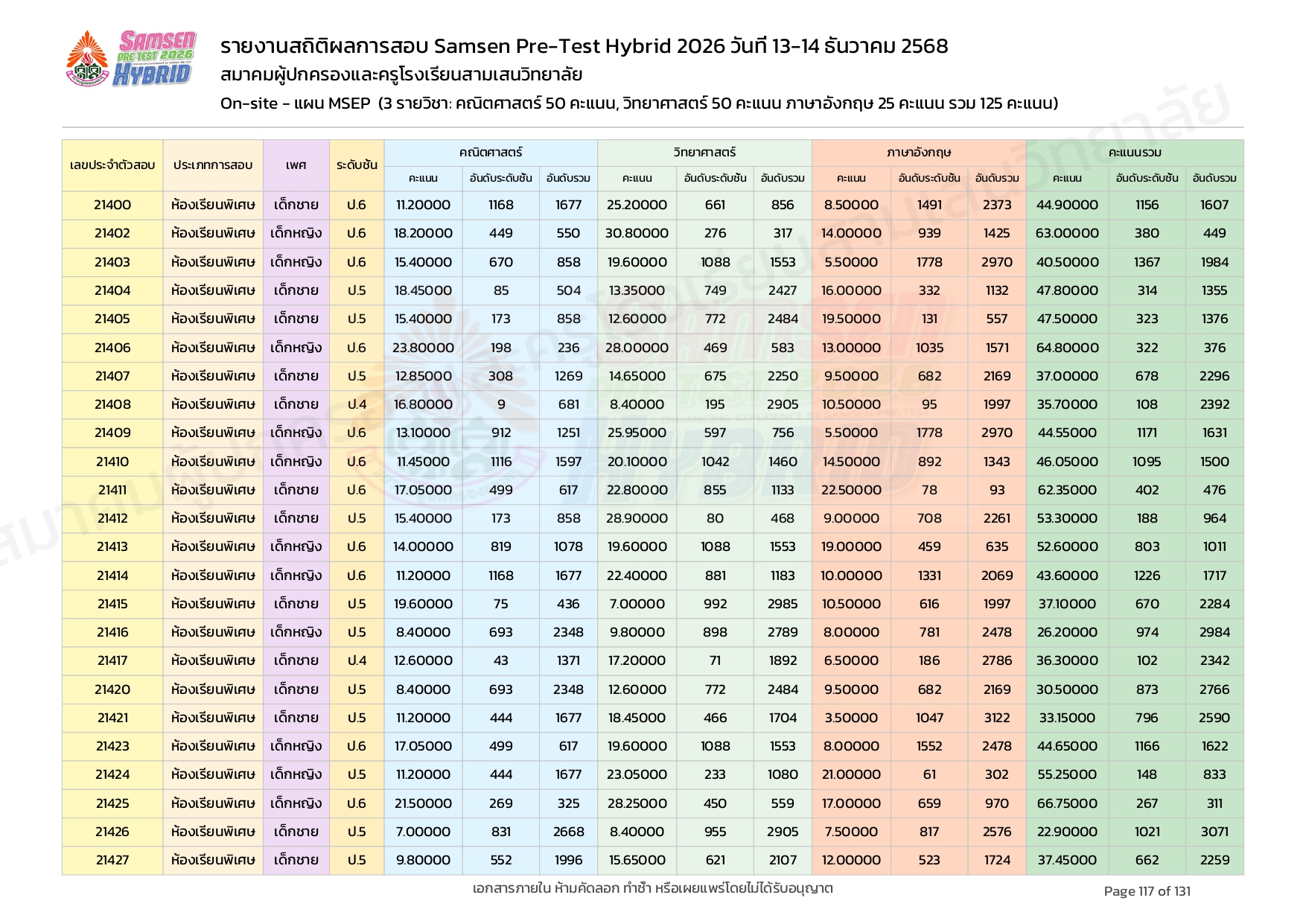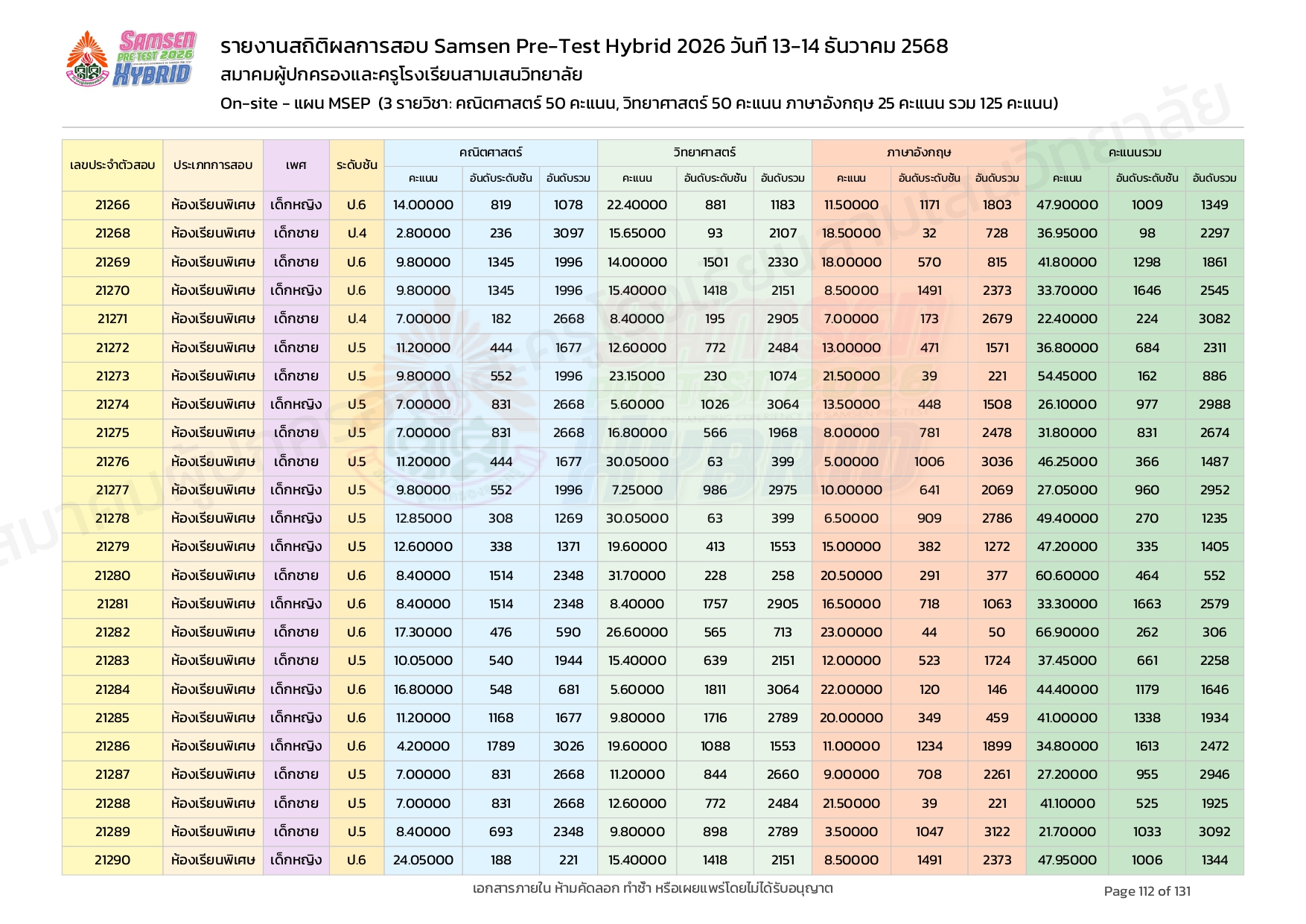 ผลคะแนนสอบ On-site จัดลำดับตามห้องเรียนพิเศษ MSEP