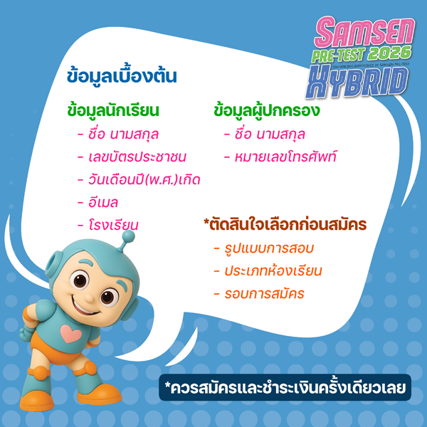 ศูนย์รวมข่าวสารประชาสัมพันธ์ โครงการทดสอบศักยภาพนักเรียน ระดับชั้นประถมศึกษา ปีที่ 4-6 Samsen Pre-Test Hybrid 2026