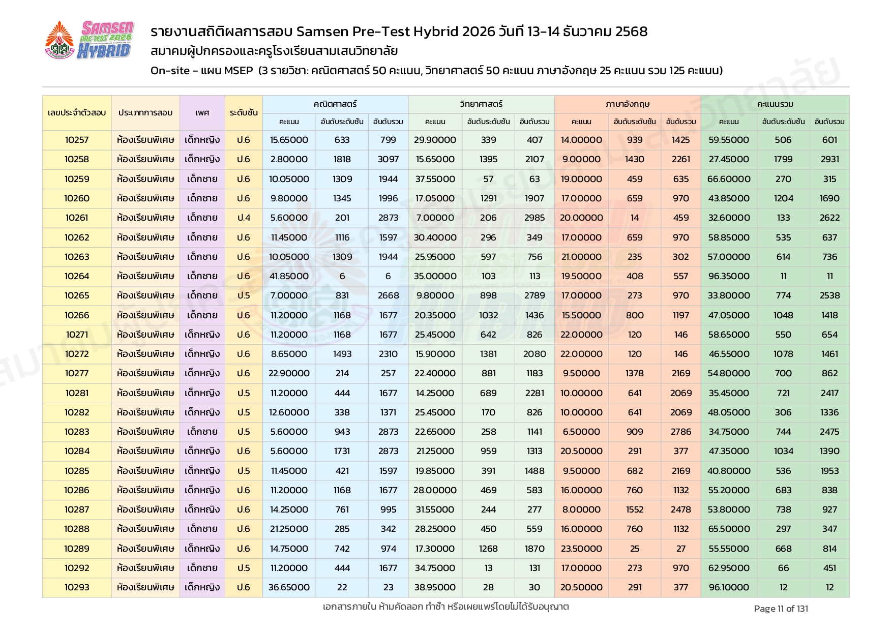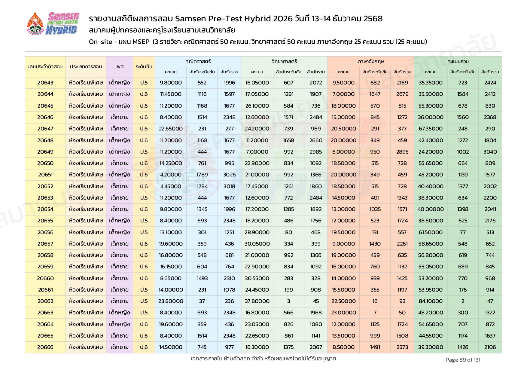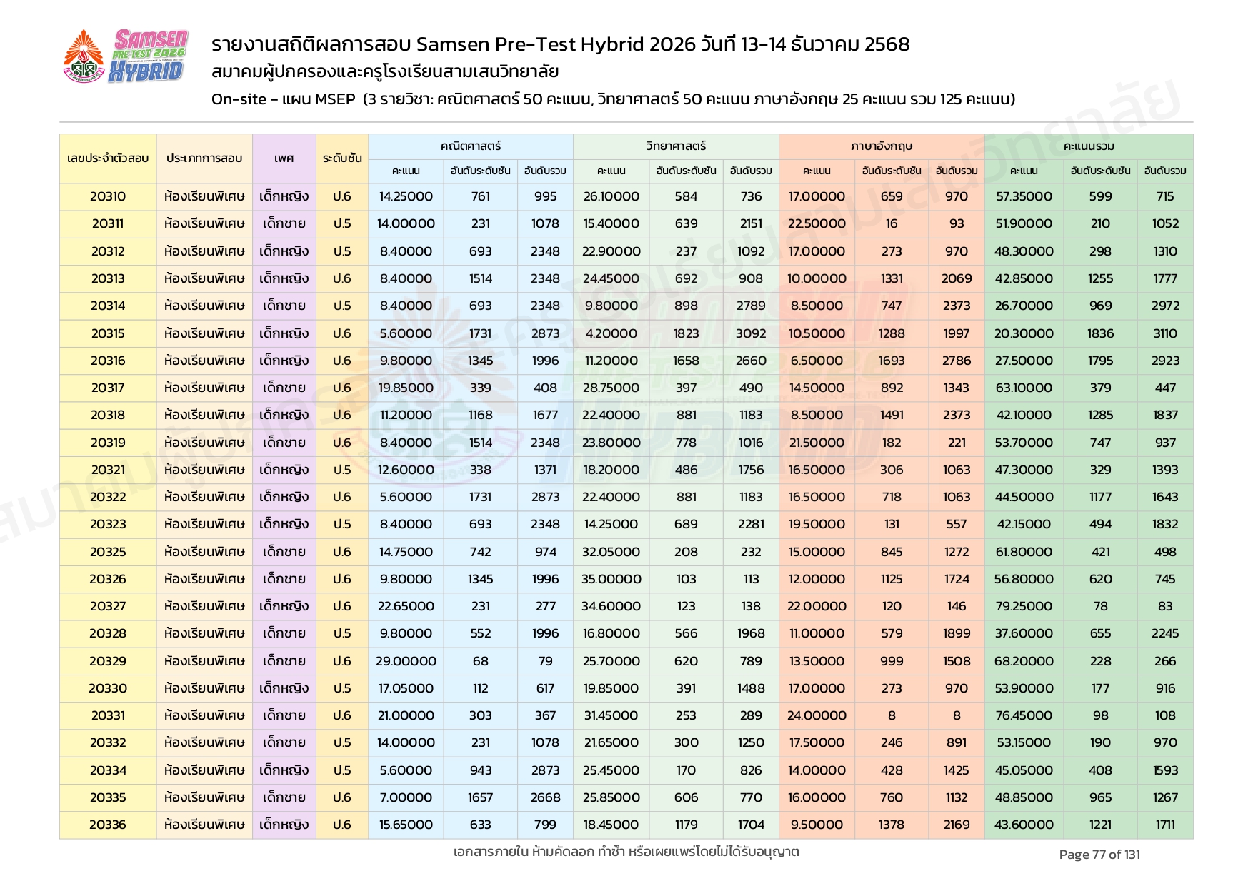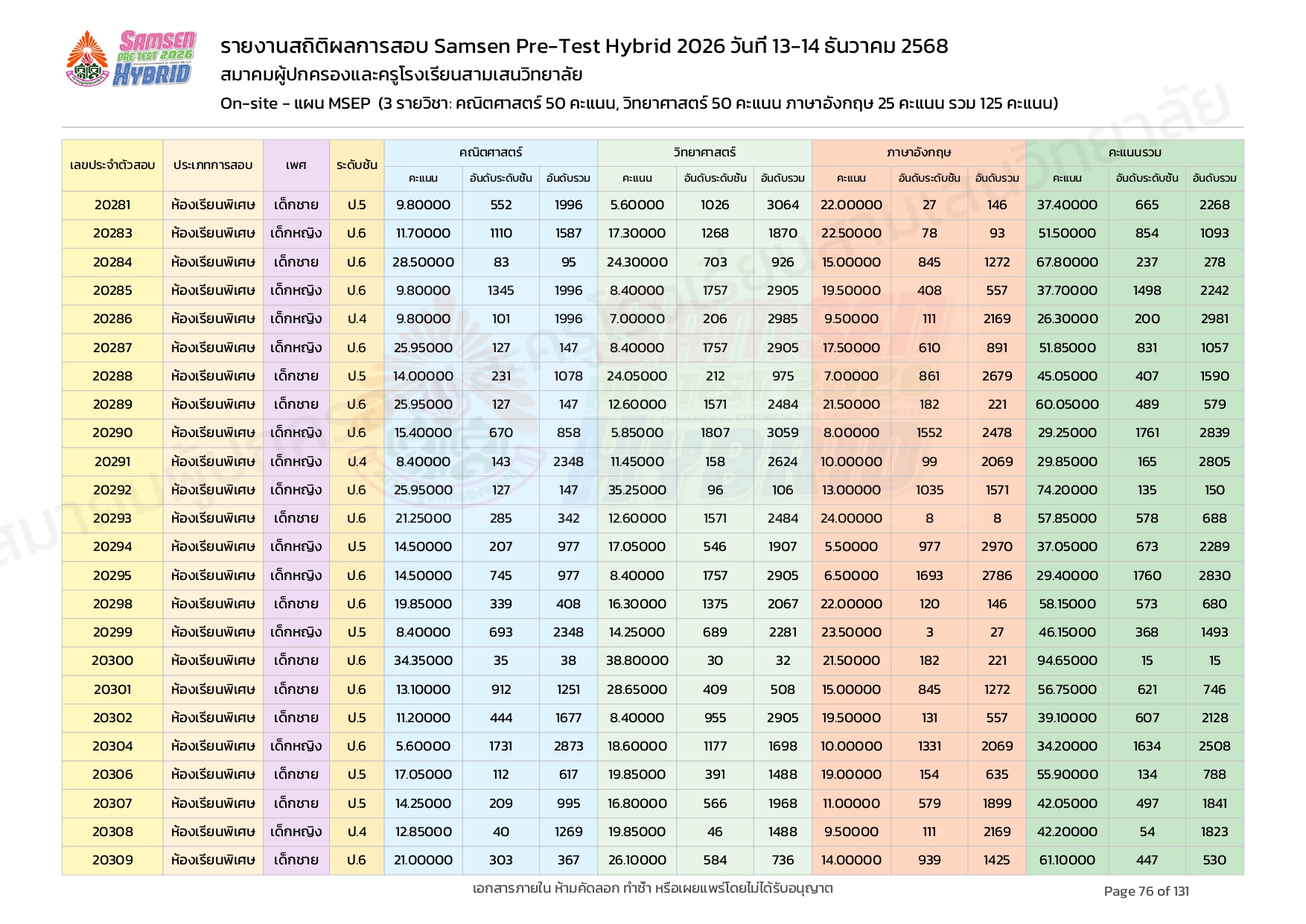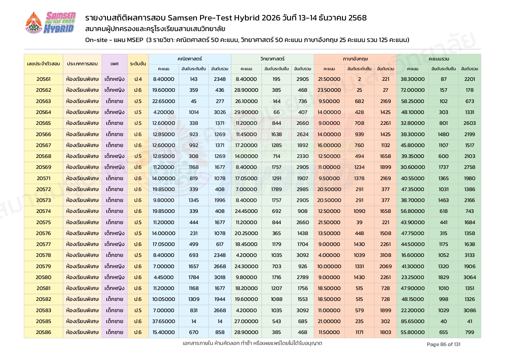 ผลคะแนนสอบ On-site จัดลำดับตามห้องเรียนพิเศษ MSEP
