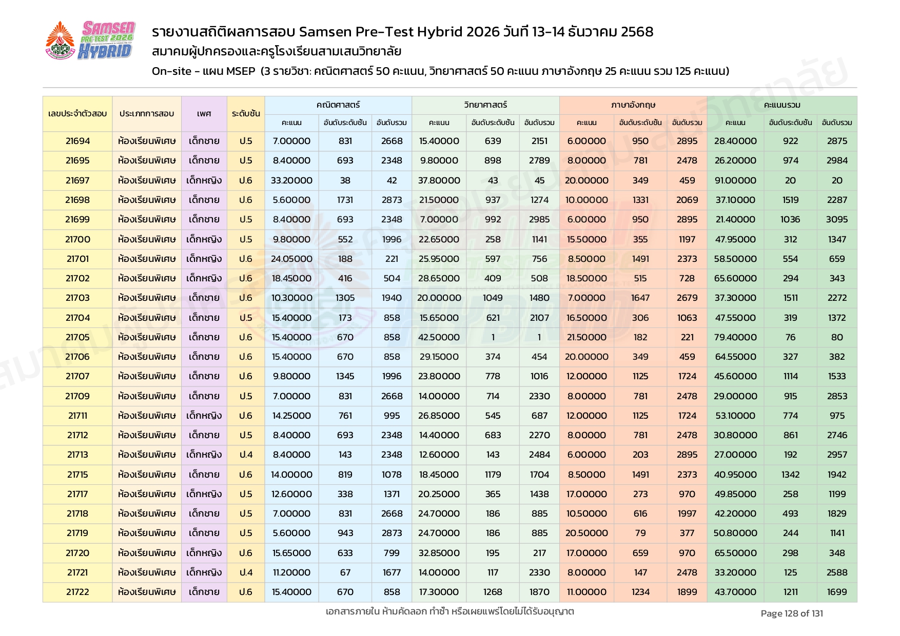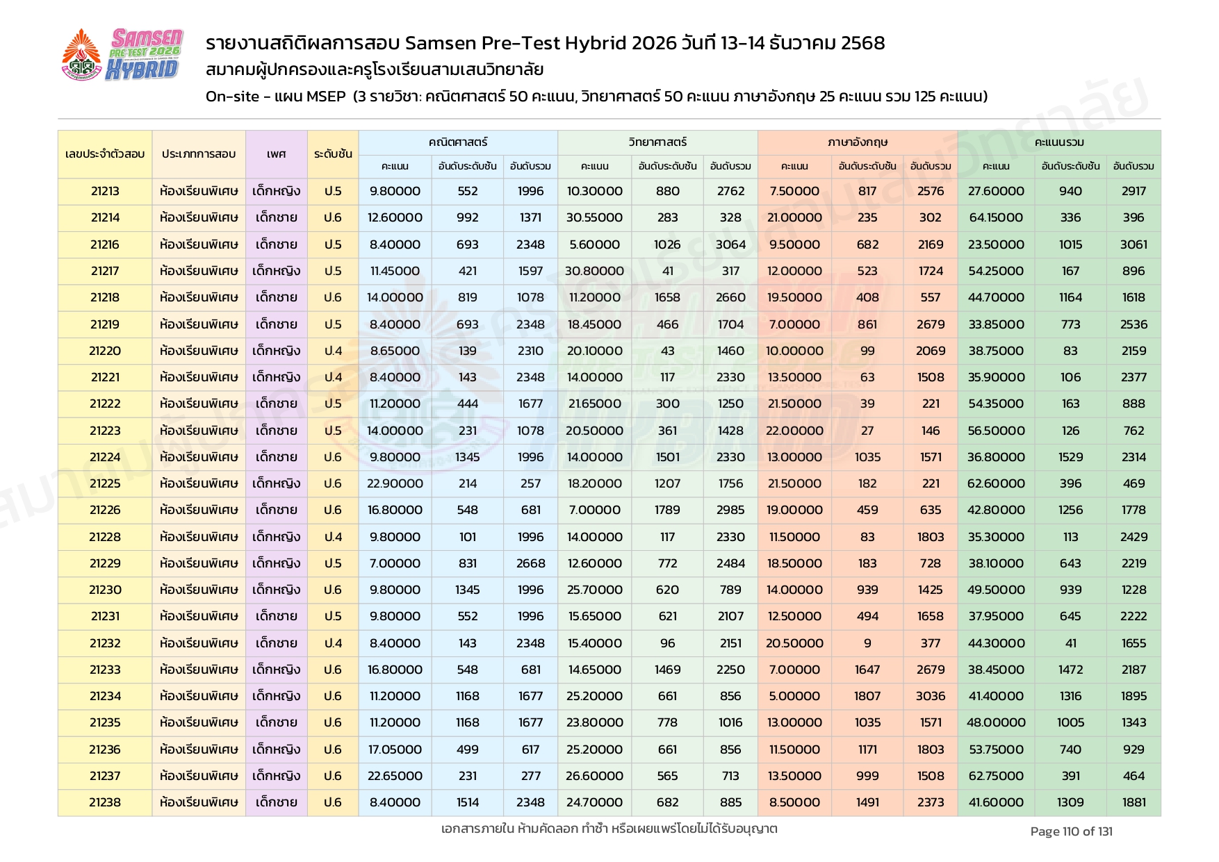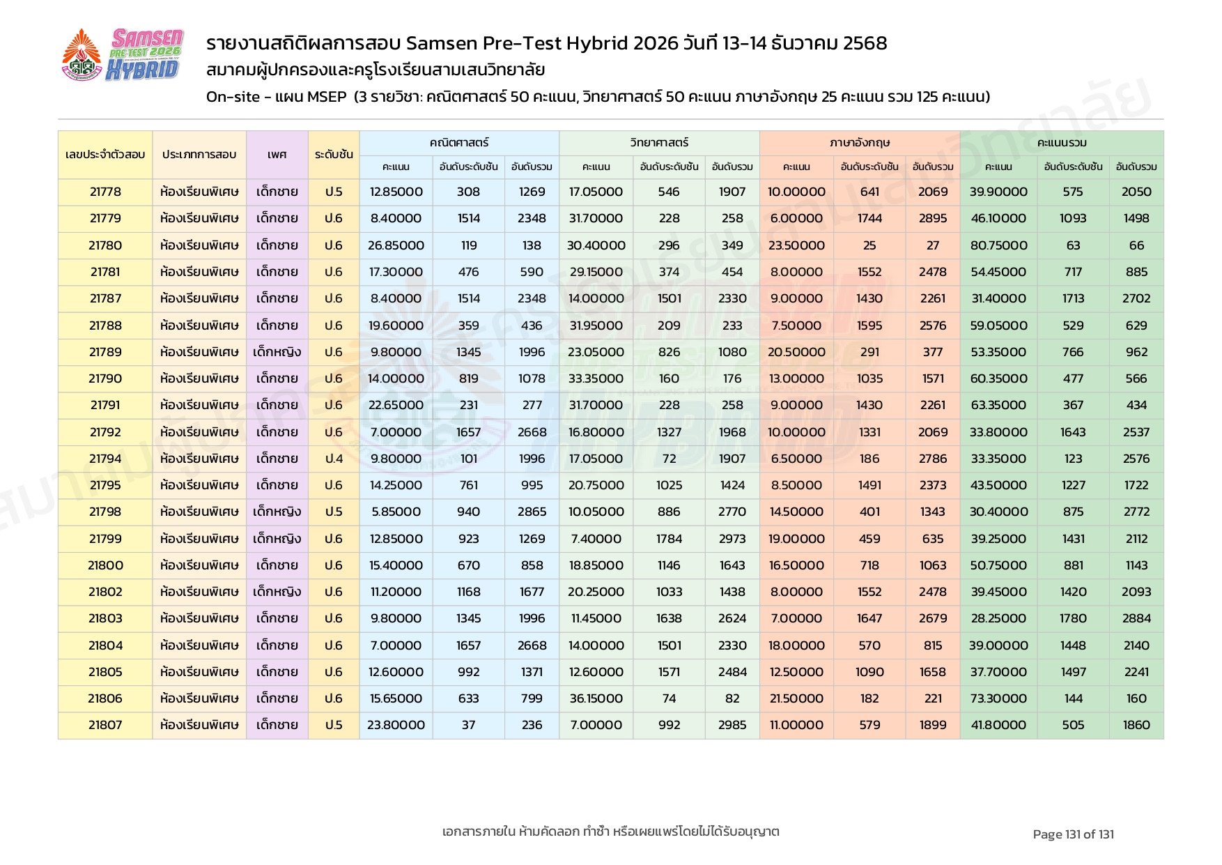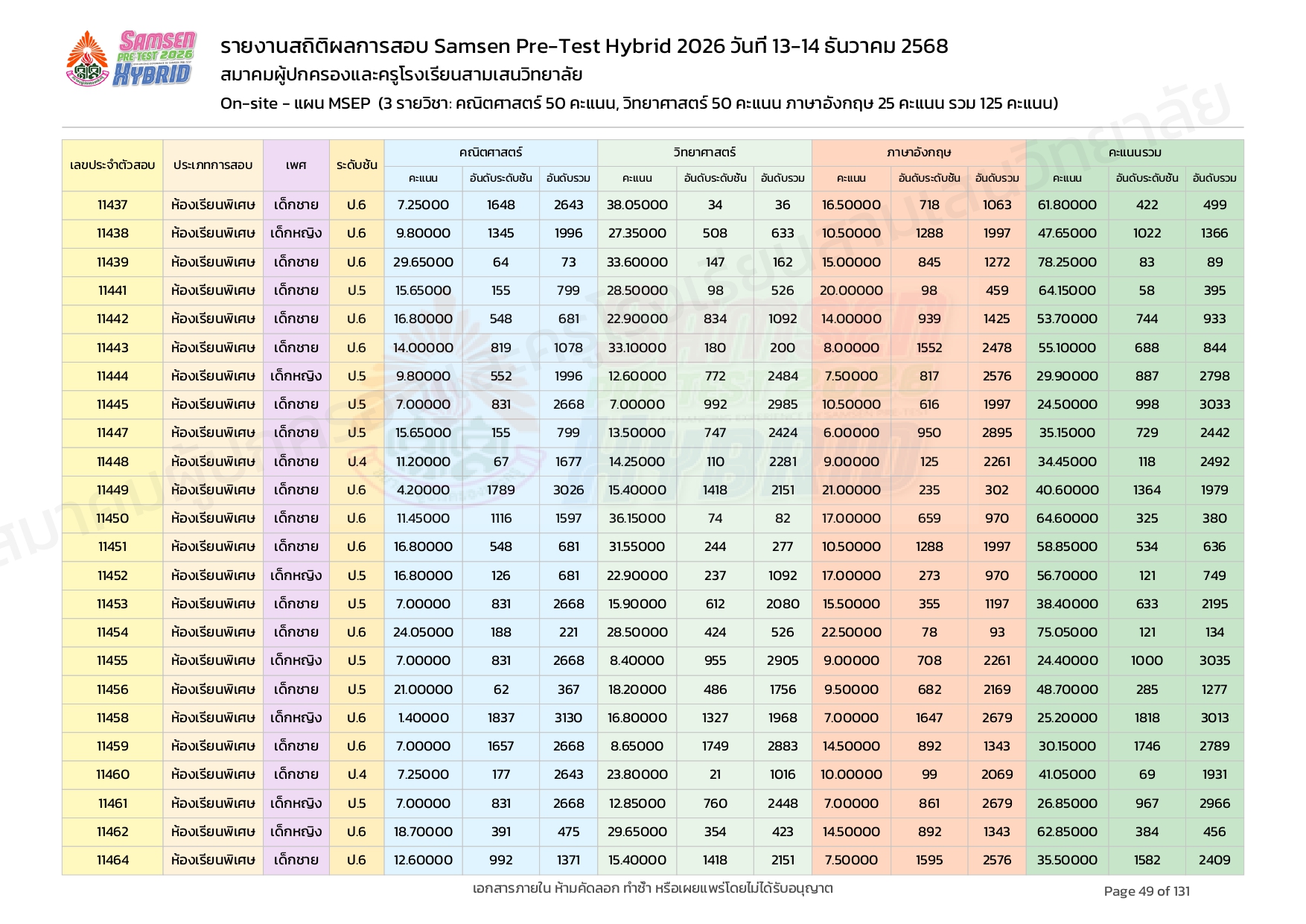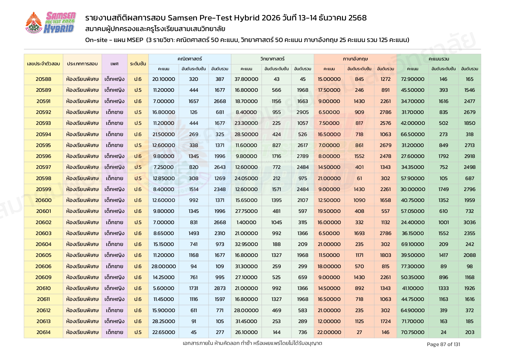 ผลคะแนนสอบ On-site จัดลำดับตามห้องเรียนพิเศษ MSEP