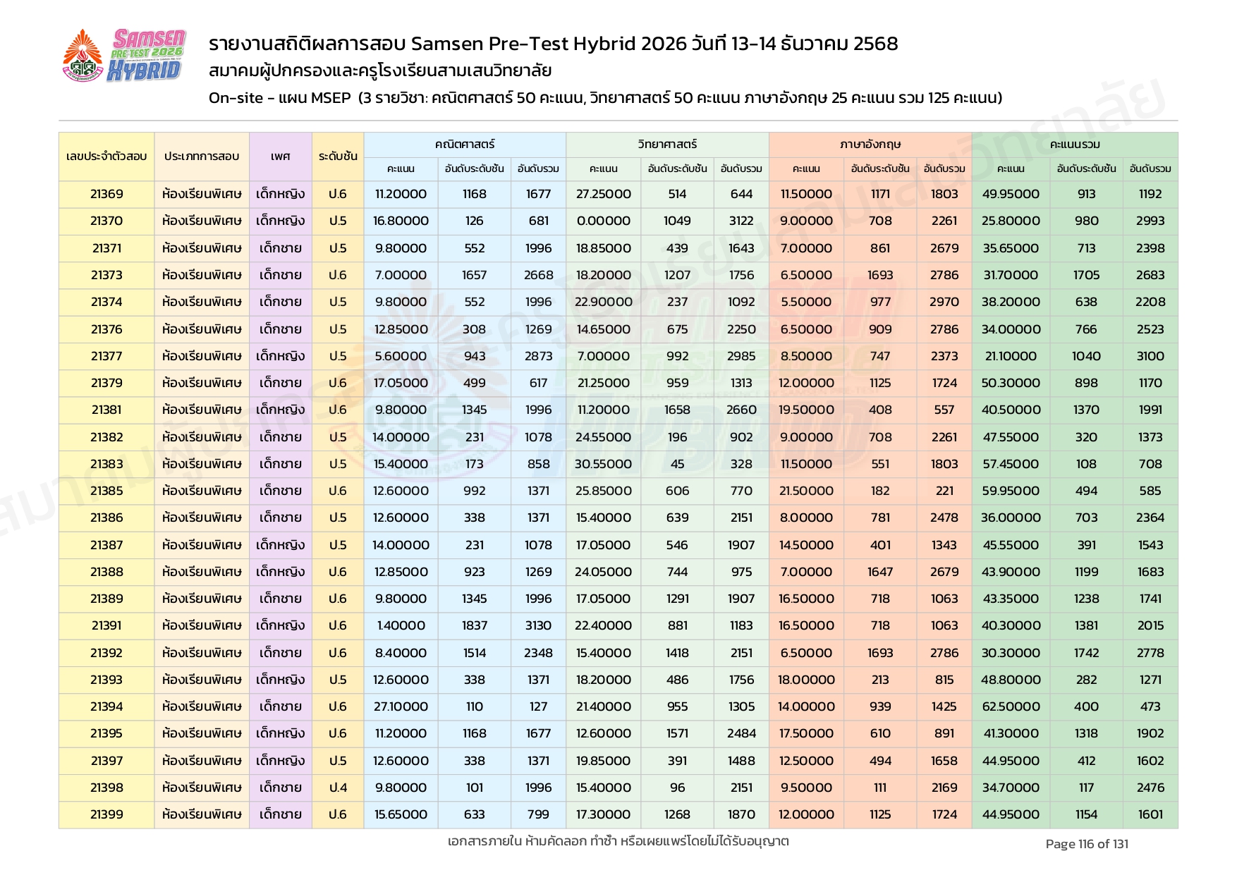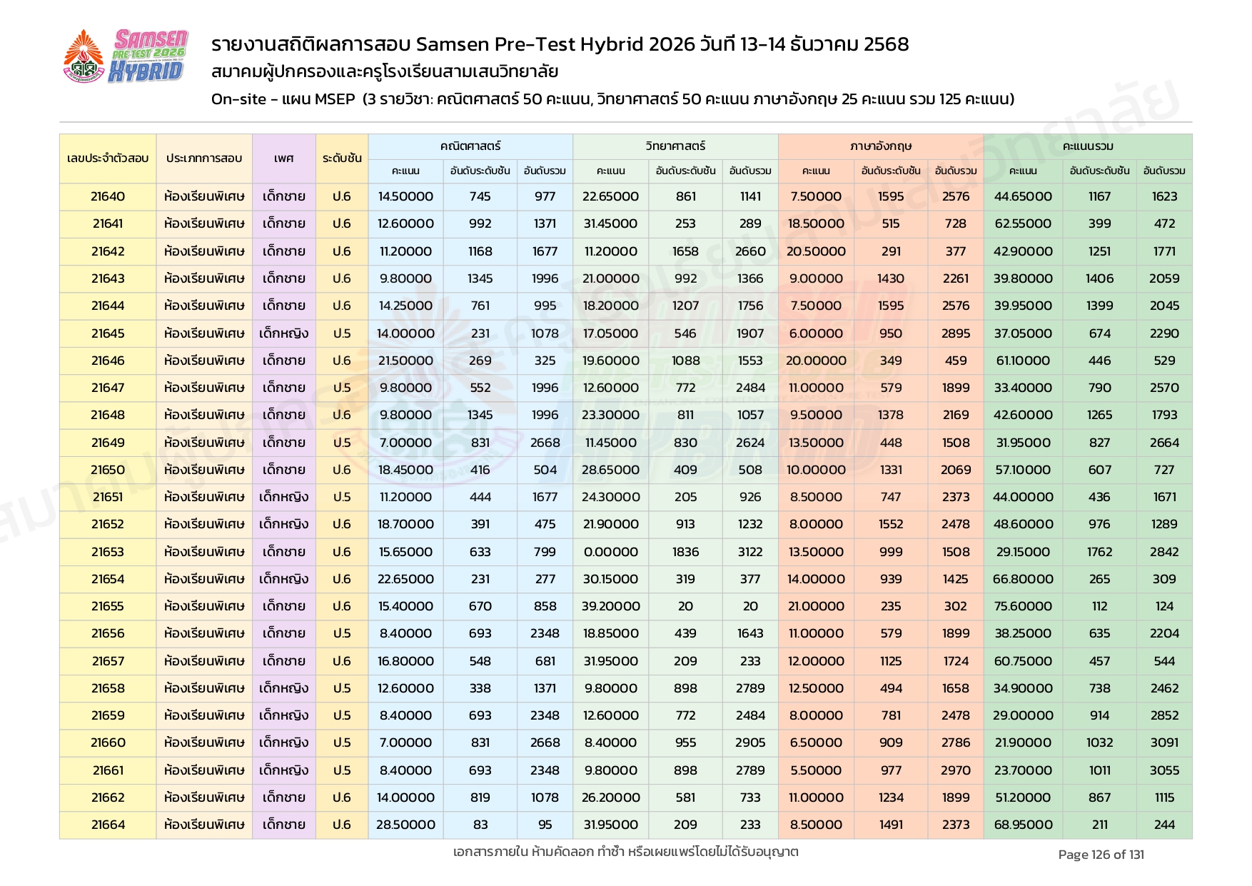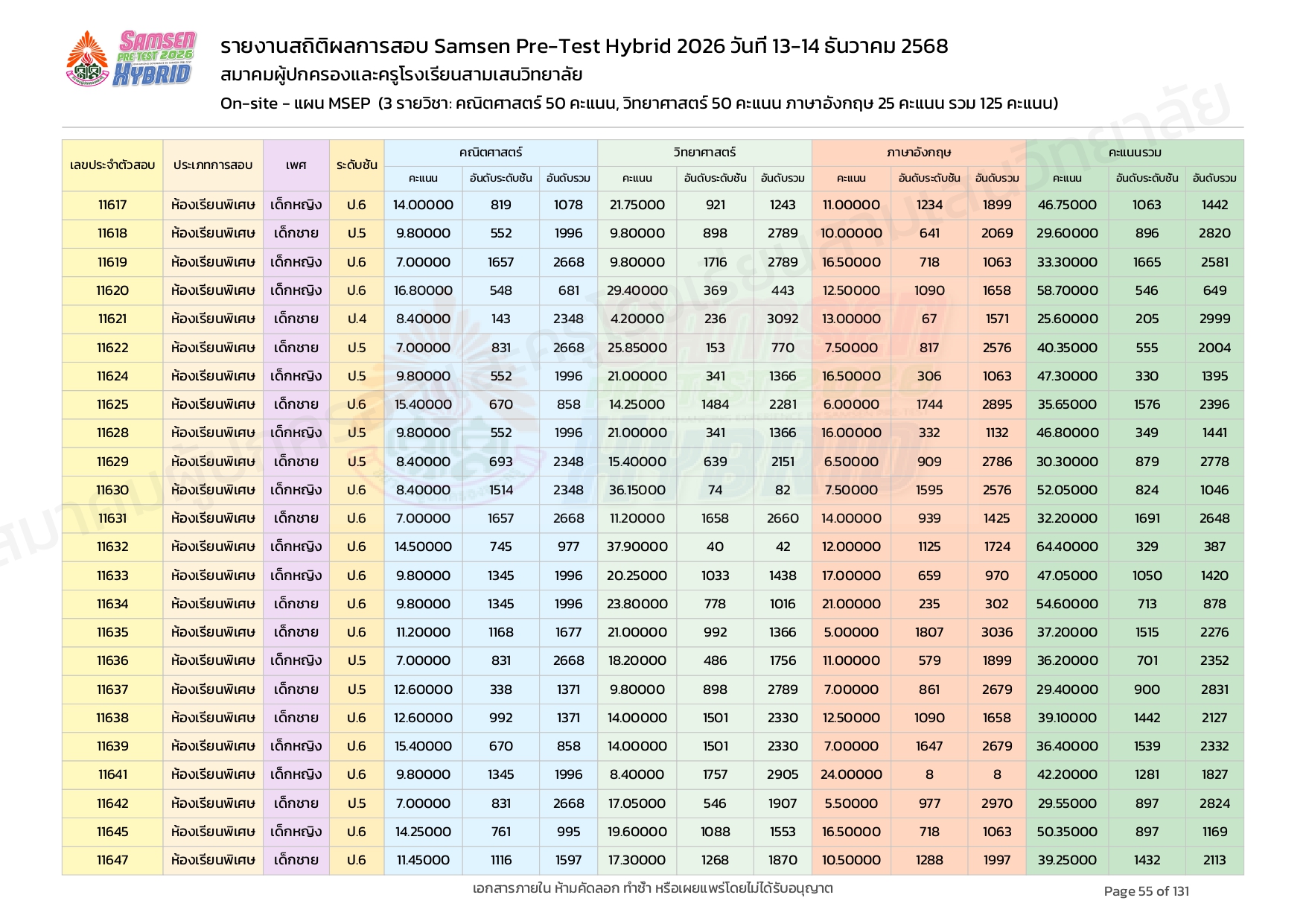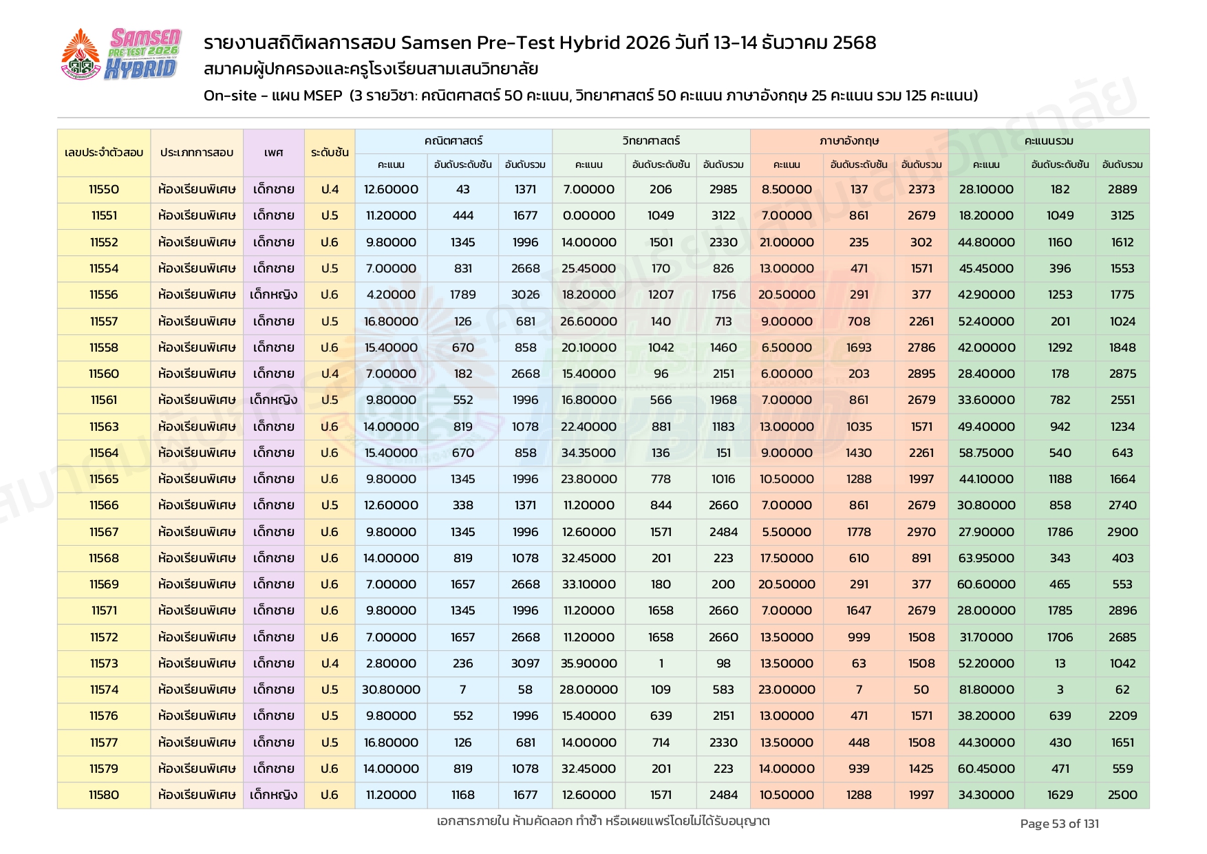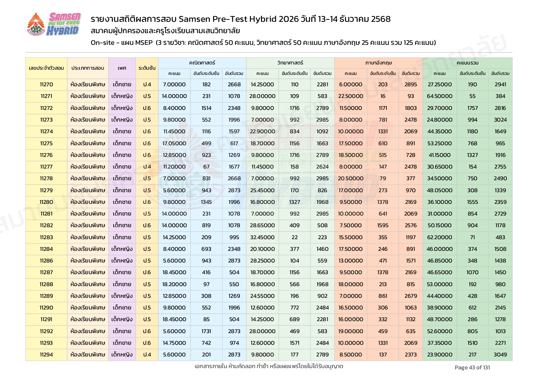 ผลคะแนนสอบ On-site จัดลำดับตามห้องเรียนพิเศษ MSEP