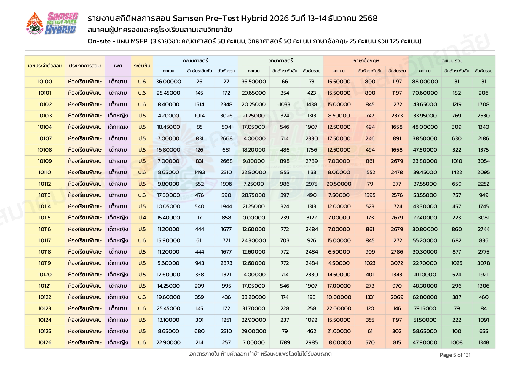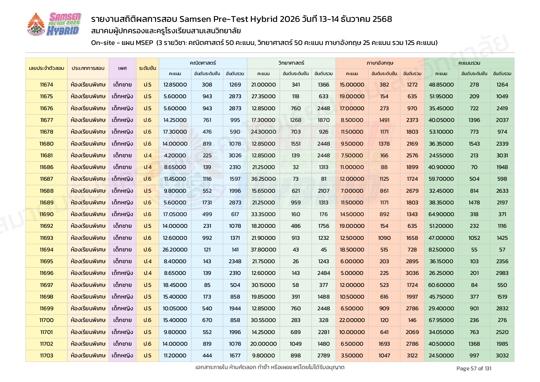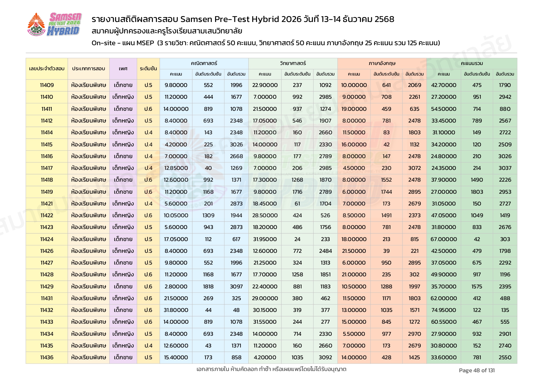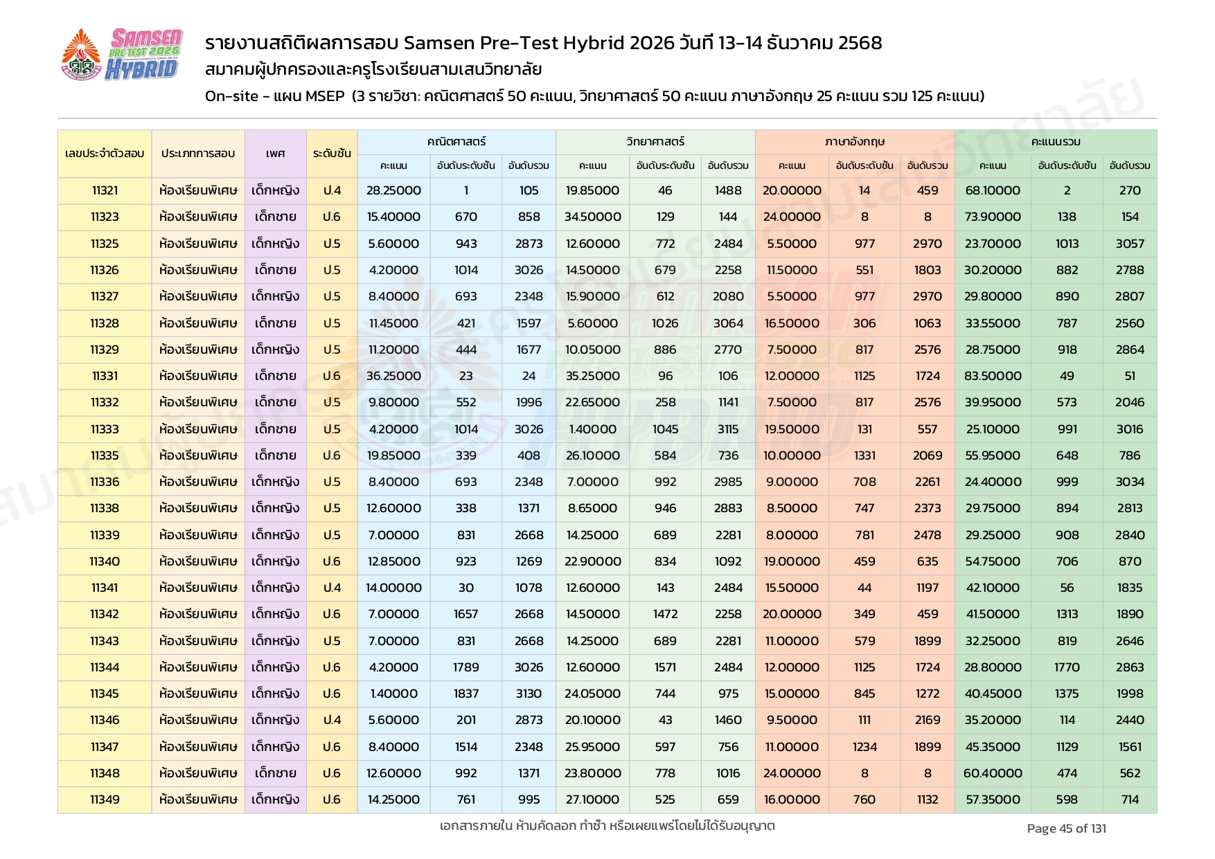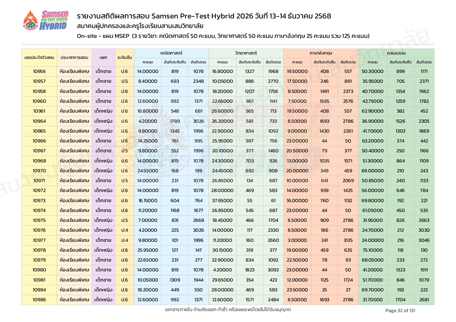 ผลคะแนนสอบ On-site จัดลำดับตามห้องเรียนพิเศษ MSEP