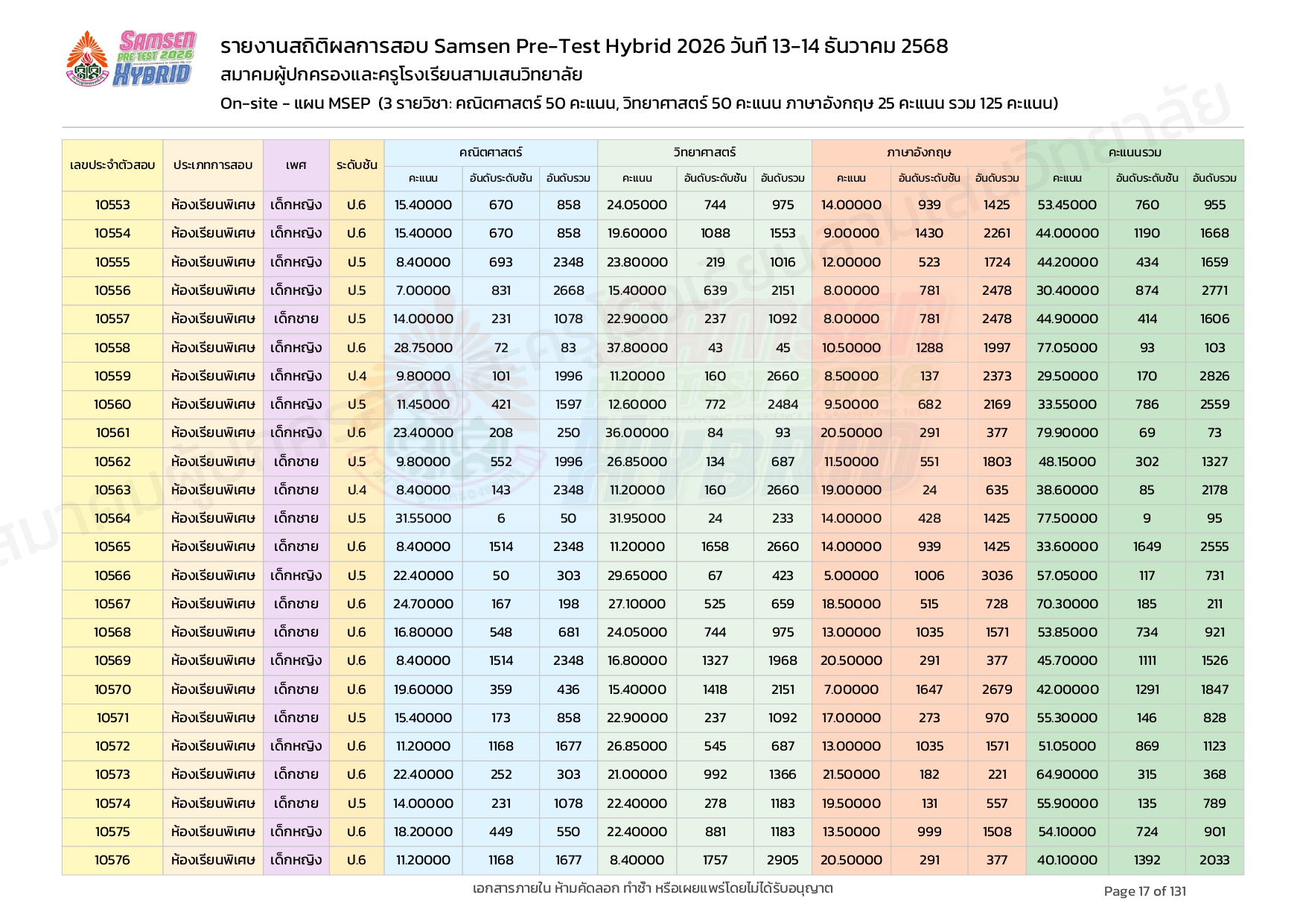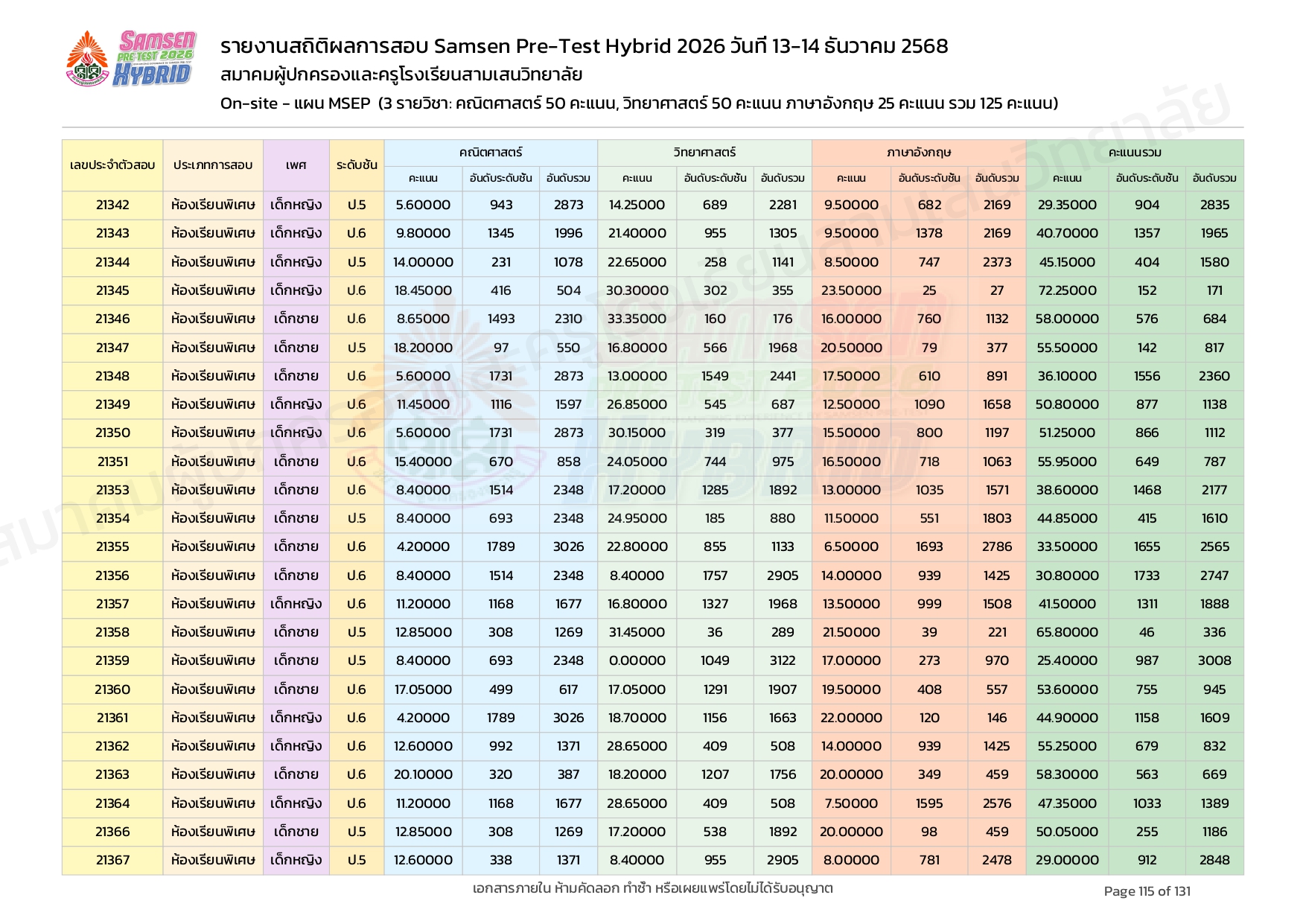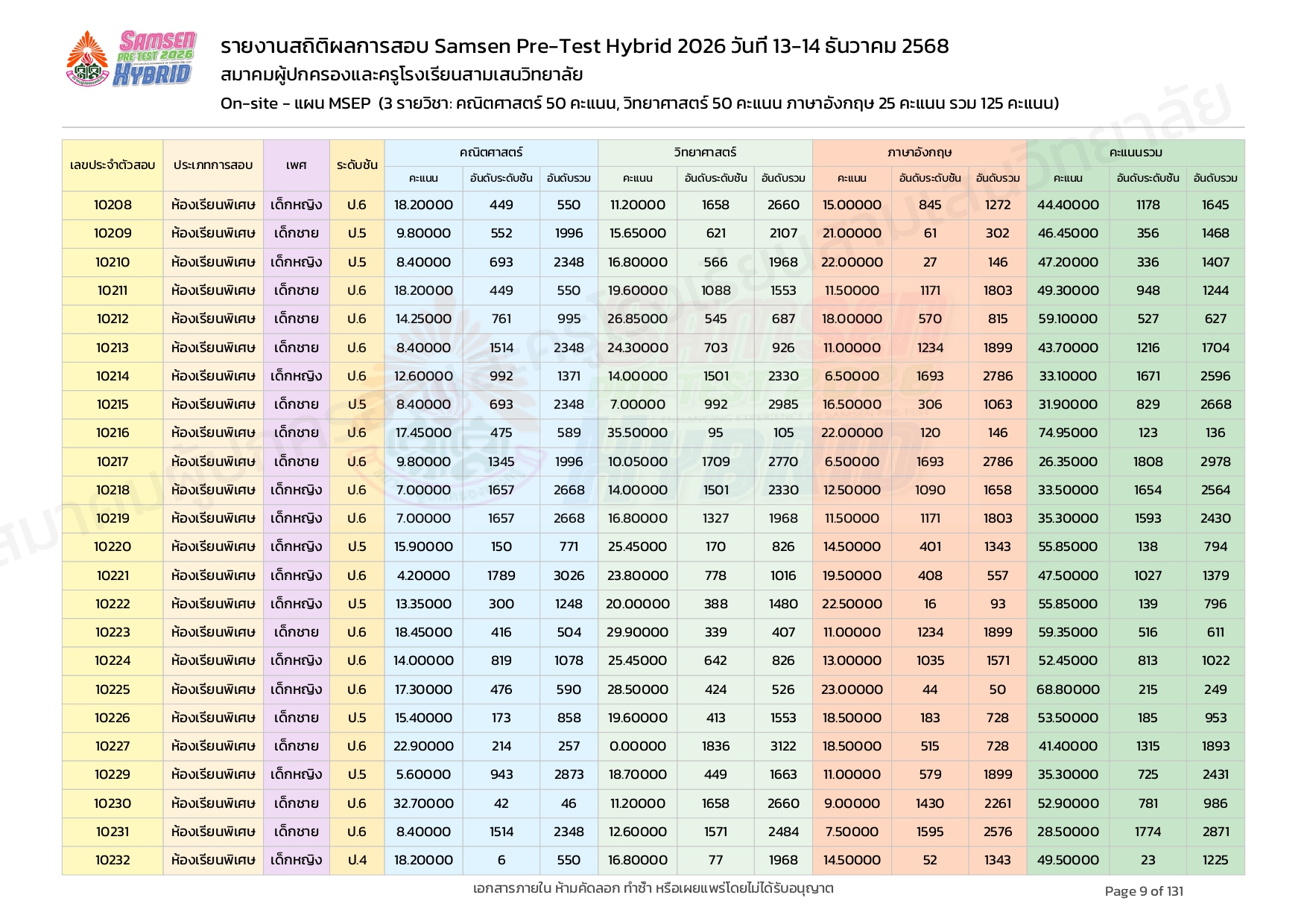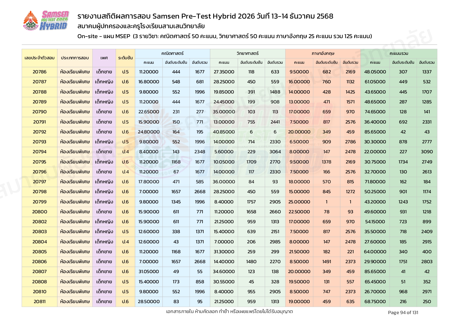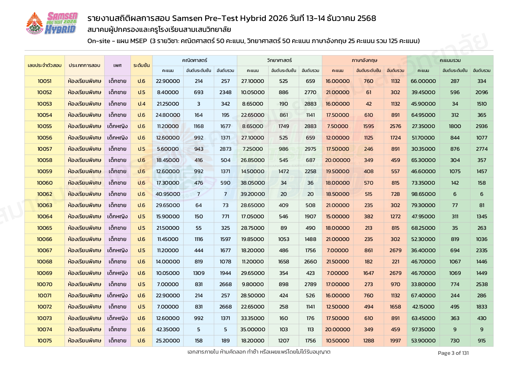 ผลคะแนนสอบ On-site จัดลำดับตามห้องเรียนพิเศษ MSEP