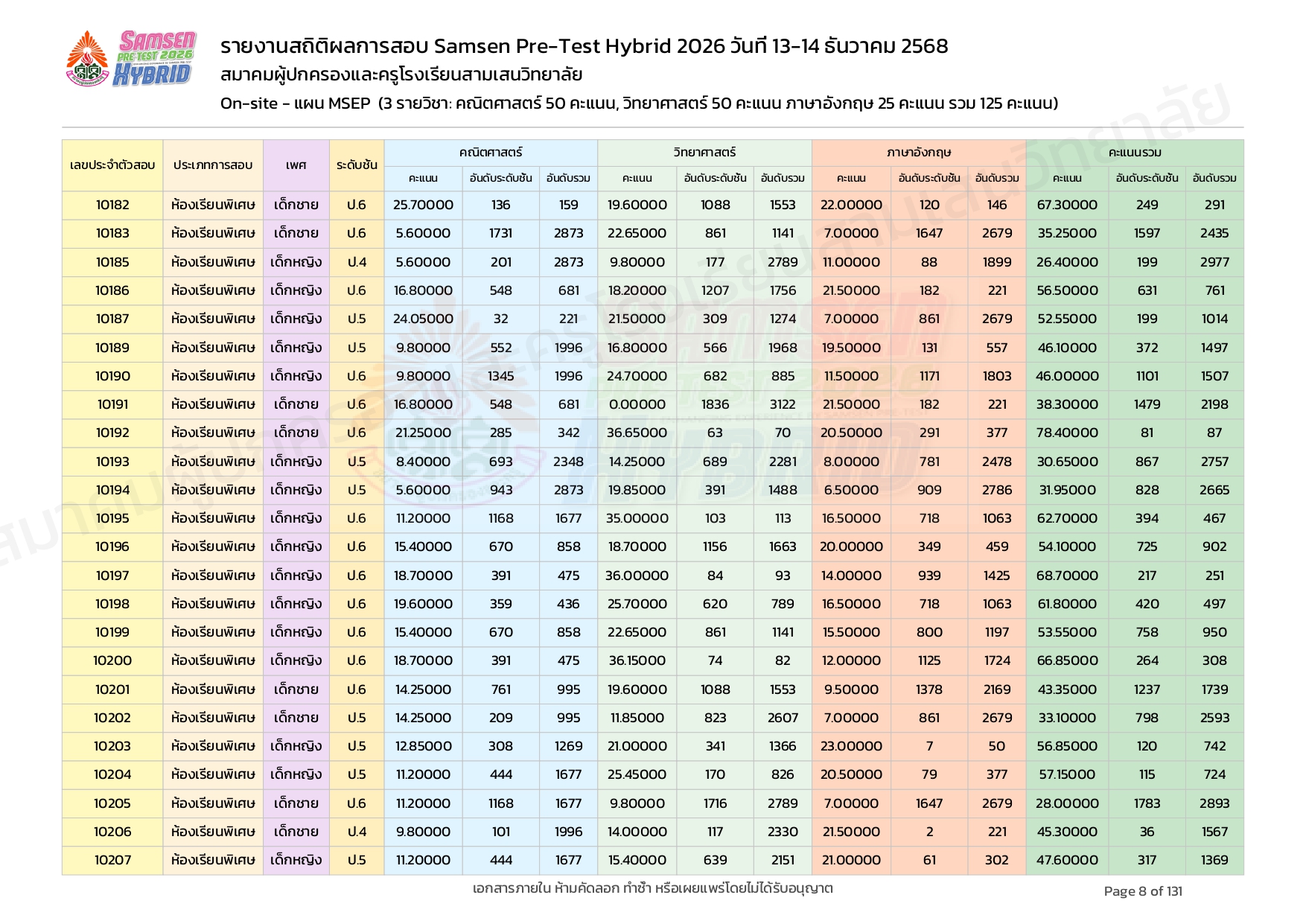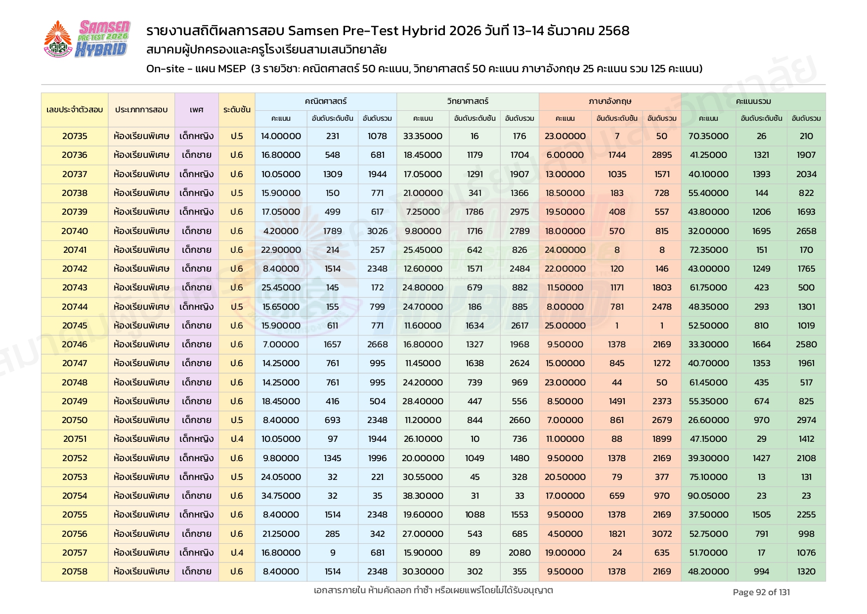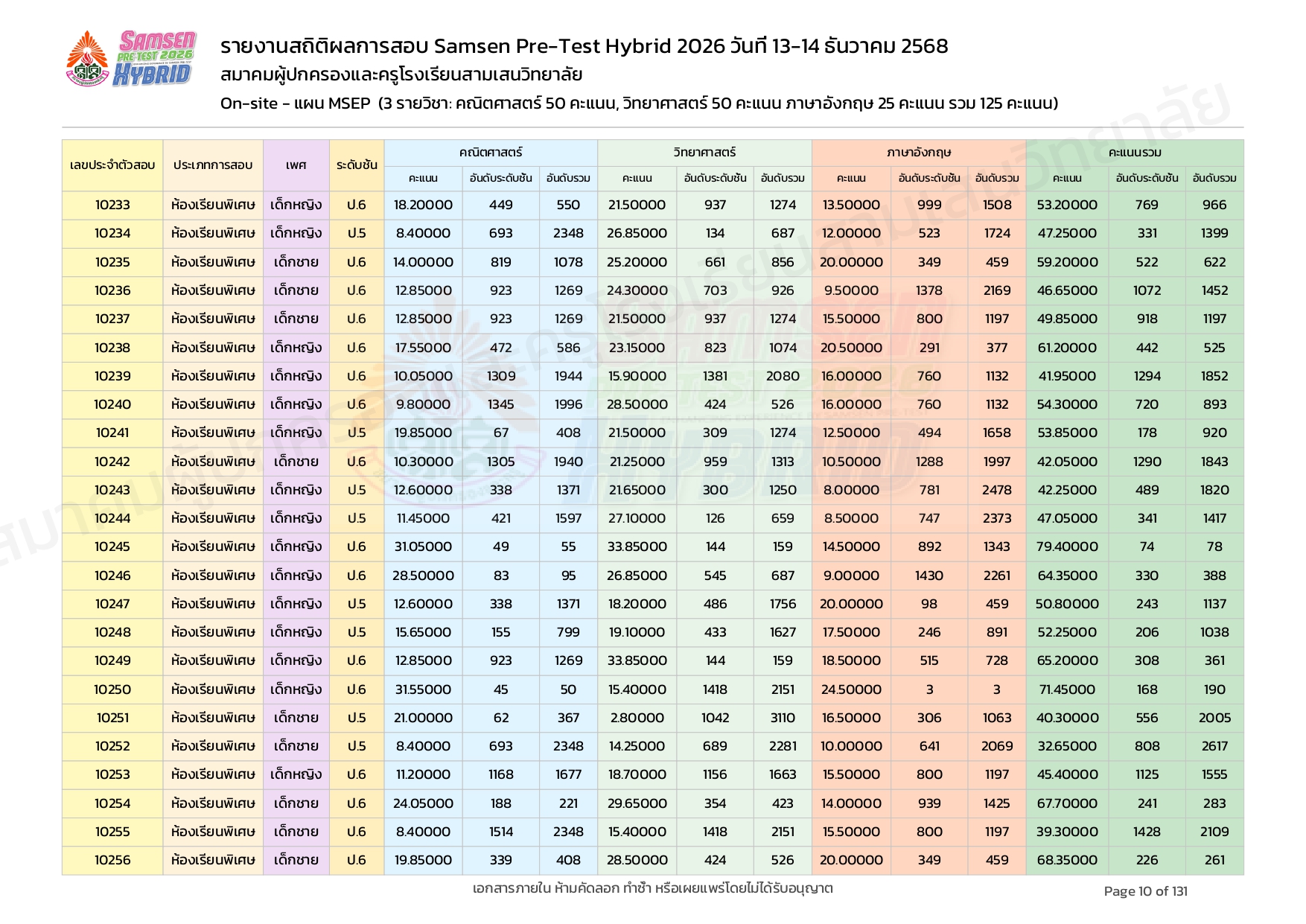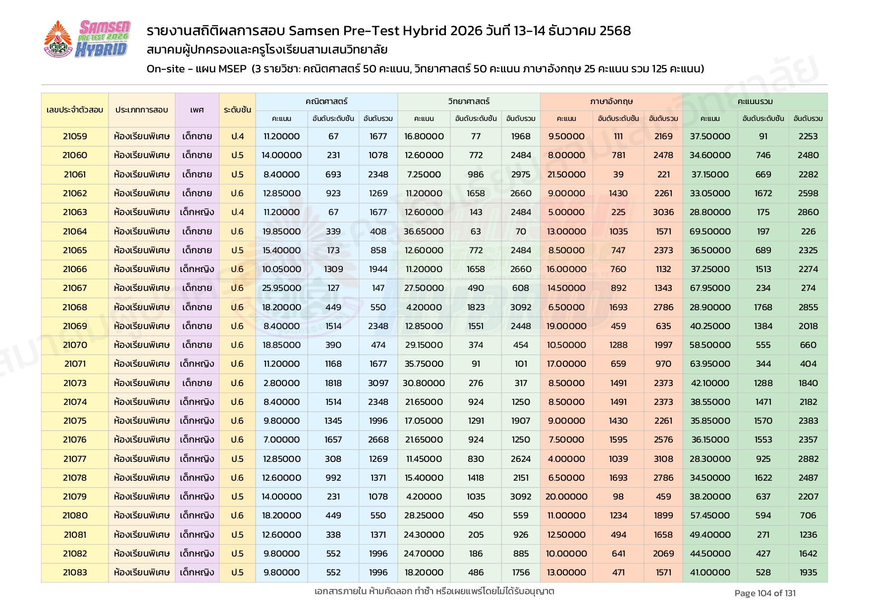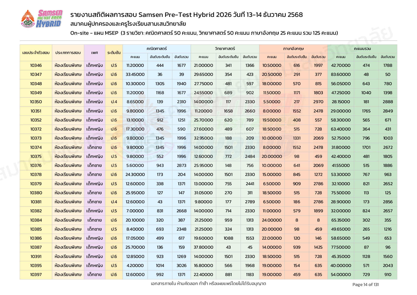 ผลคะแนนสอบ On-site จัดลำดับตามห้องเรียนพิเศษ MSEP