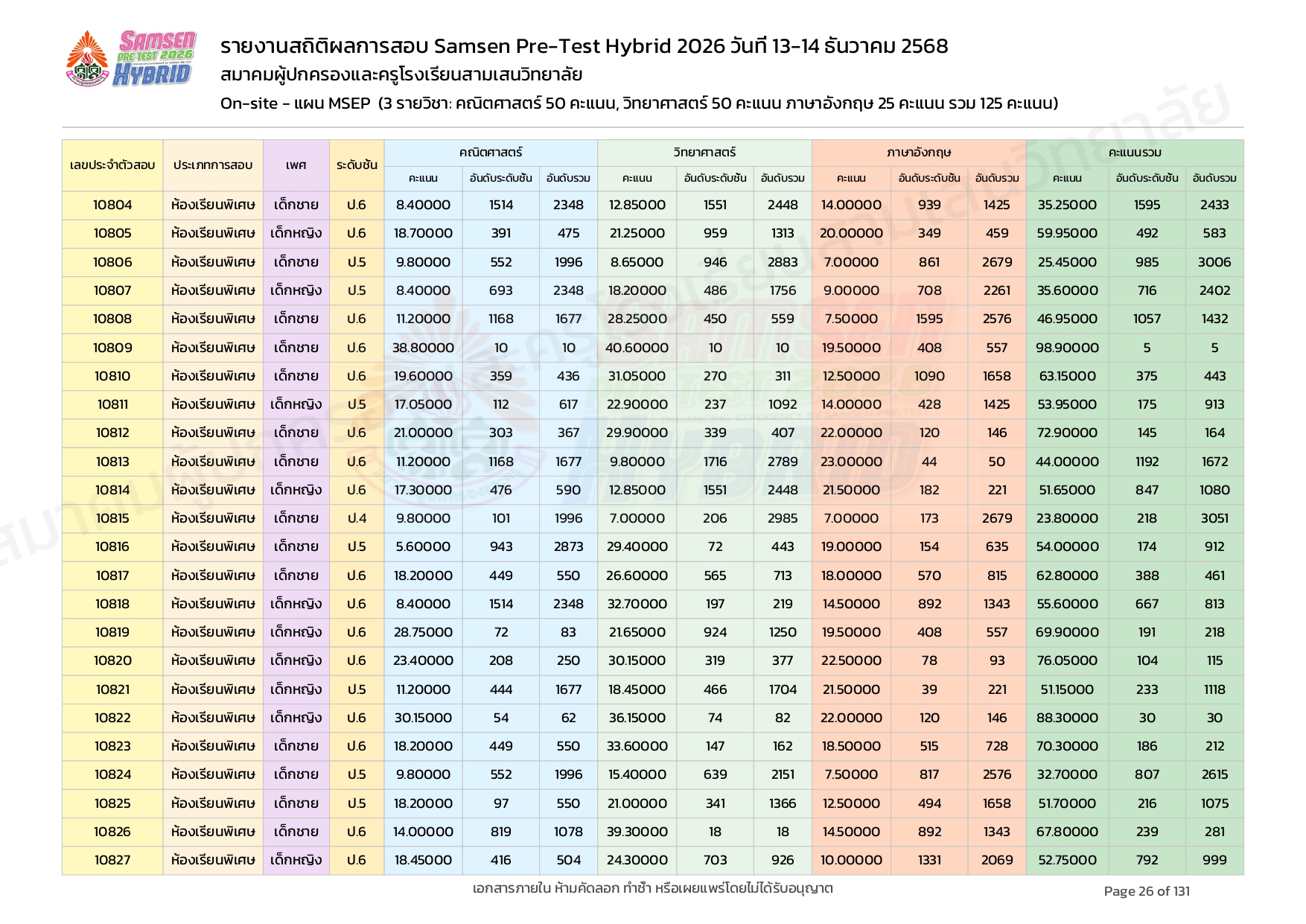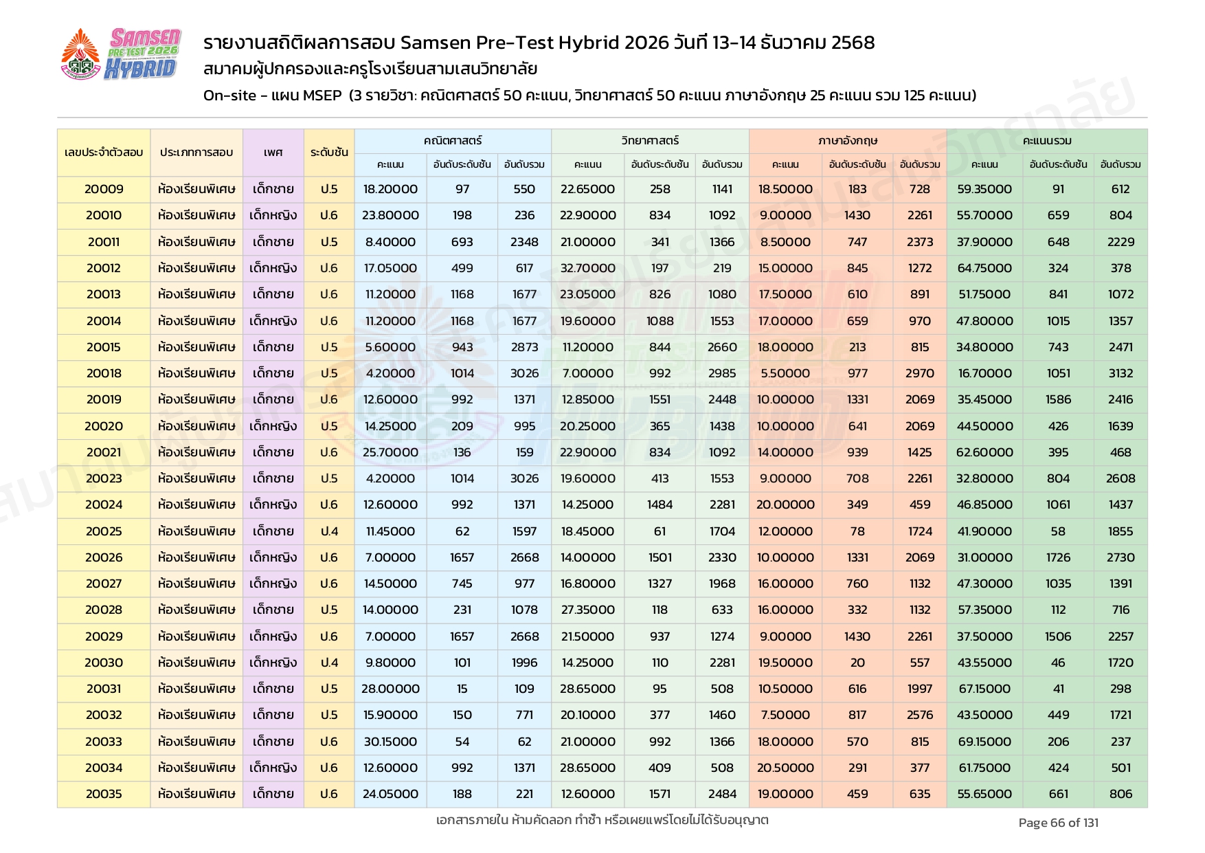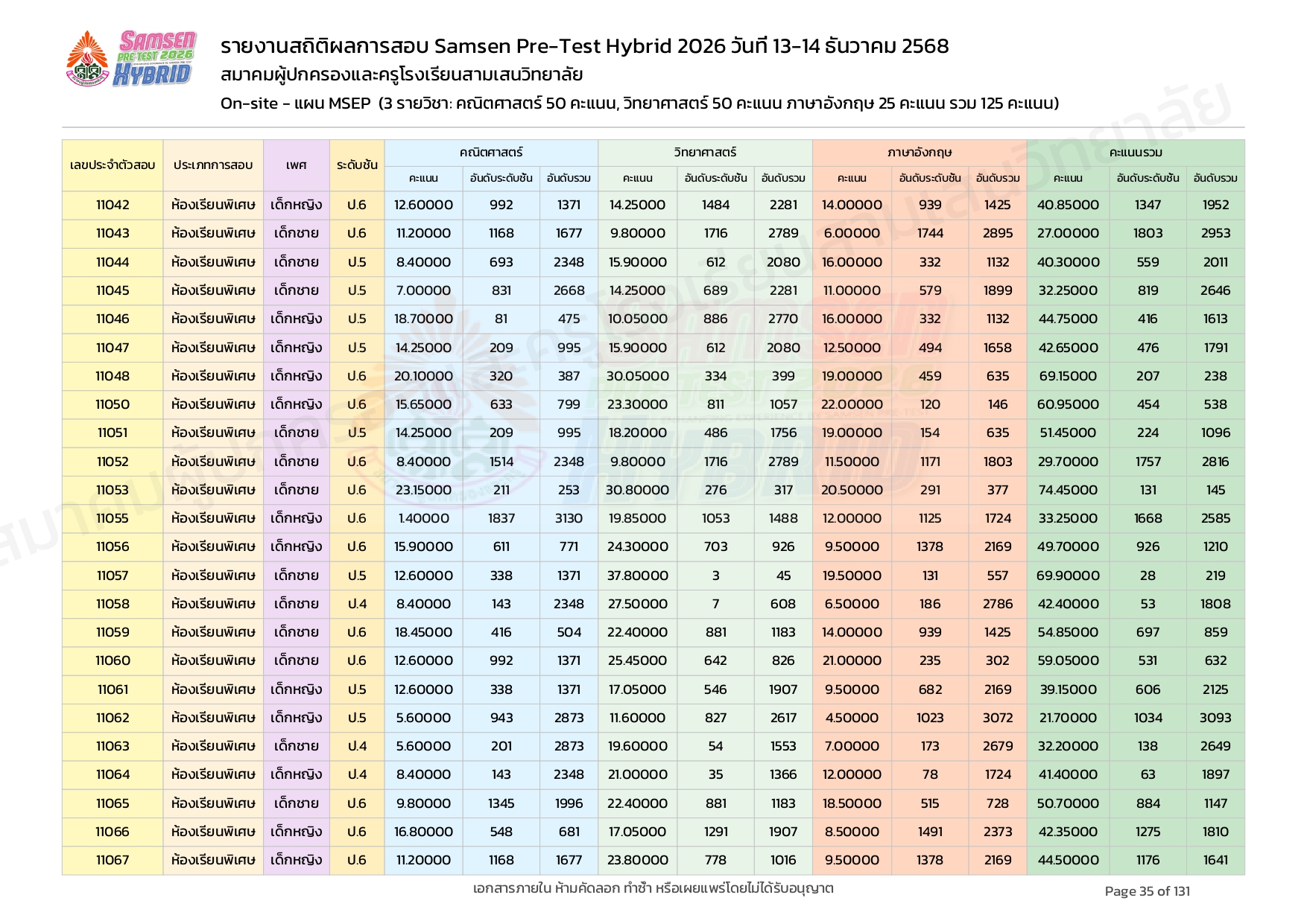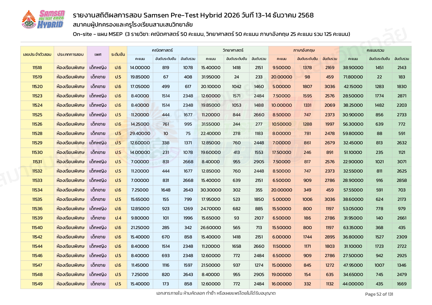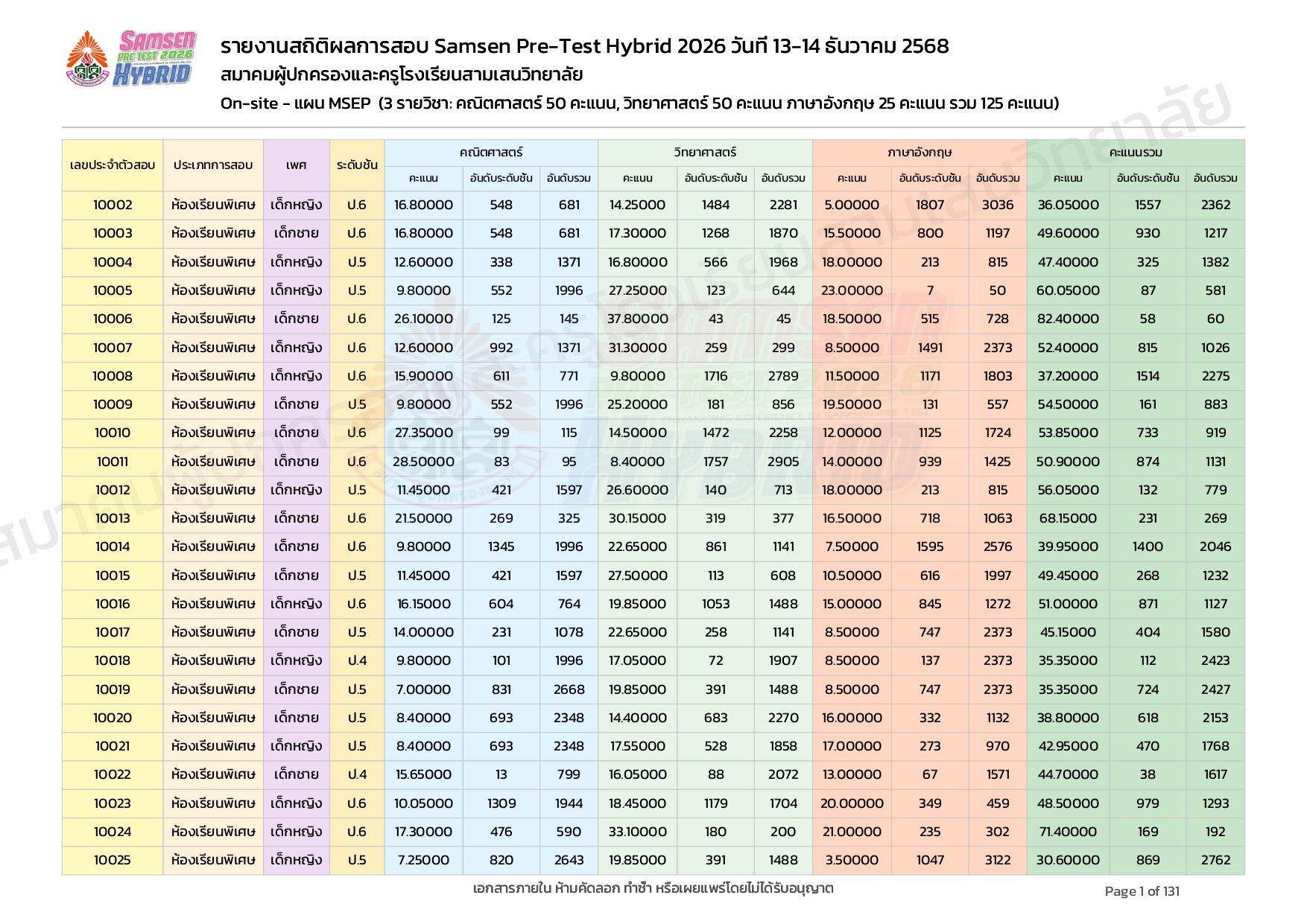 ผลคะแนนสอบ On-site จัดลำดับตามห้องเรียนพิเศษ MSEP